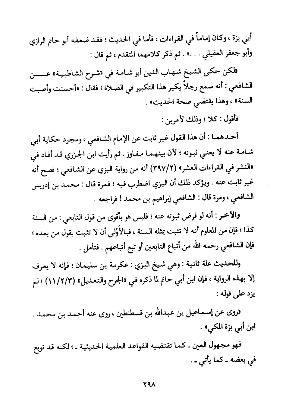 أبي بزة، وكان إماماً في القراءات، فأما في الحديث؛ فقد ضعفه أبو حاتم الرازي