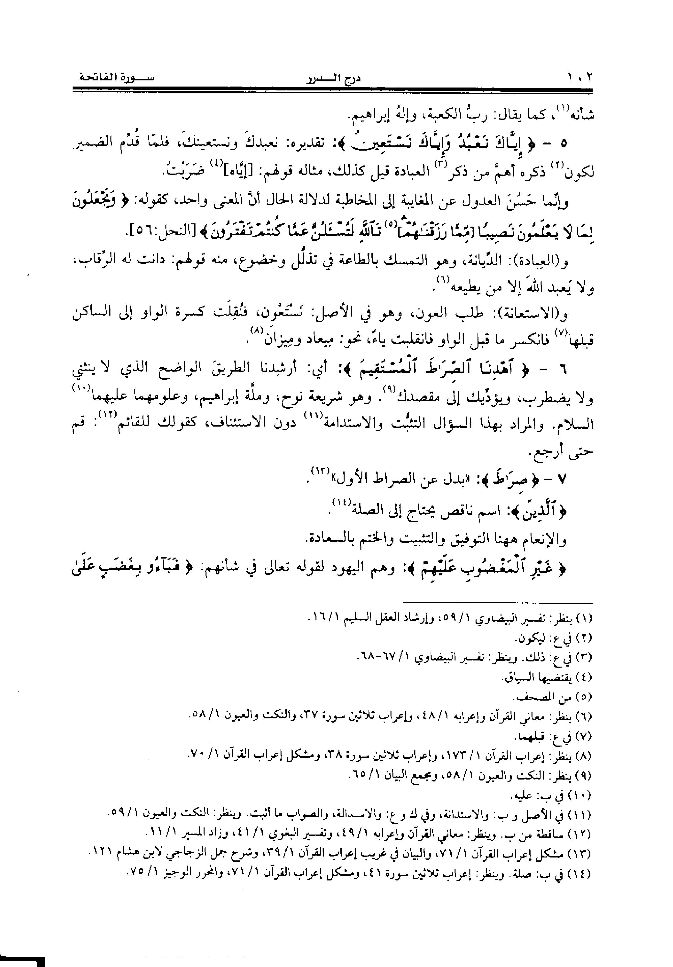 5 - {إِيّاكَ نَعْبُدُ وَإِيّاكَ نَسْتَعِينُ:} تقديره: نعبدك ونستعينك، فلمّا قدّم الضمير لكون (¬2) ذكره أهمّ من ذكر (¬3) العبادة قيل كذلك، مثاله قولهم: [إيّاه] (¬4) ضربت.