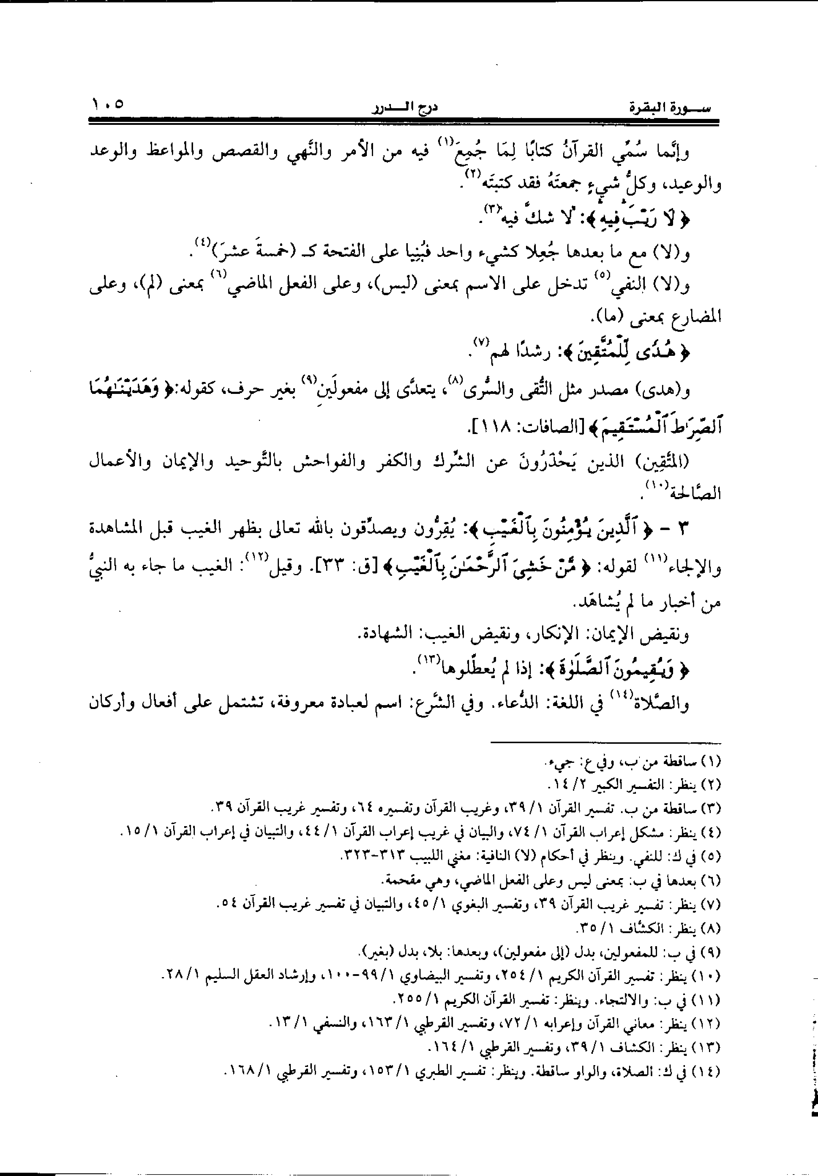 (¬10) ينظر: تفسير القرآن الكريم 1/ 254، وتفسير البيضاوي 1/ 99 - 100، وإرشاد العقل السليم 1/ 28.