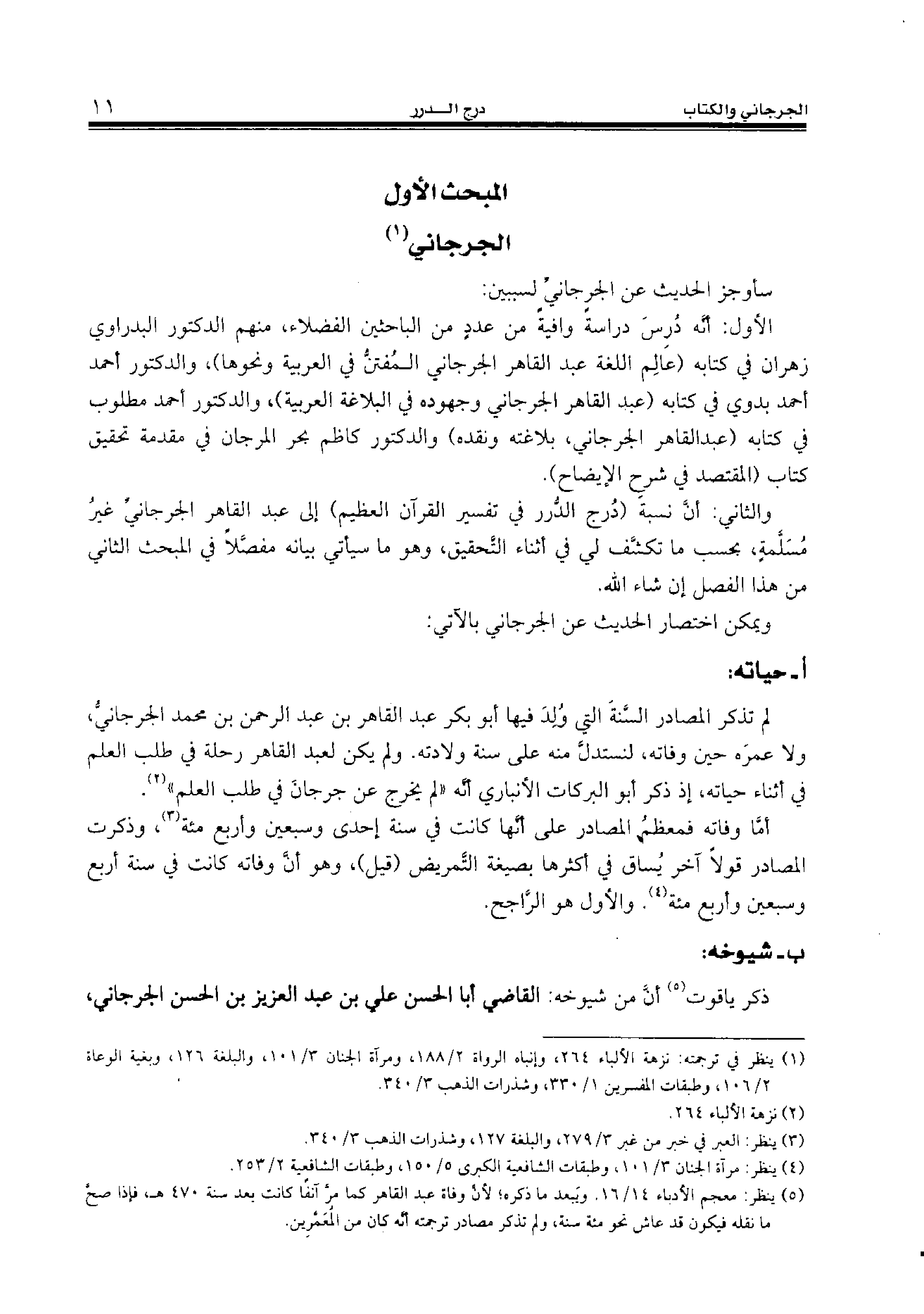 (¬5) ينظر: معجم الأدباء 14/ 16. ويبعد ما ذكره؛ لأنّ وفاة عبد القاهر كما مرّ آنفا كانت بعد سنة 470 هـ، فإذا صحّ ما نقله فيكون قد عاش نحو مئة سنة، ولم تذكر مصادر ترجمته أنّه كان من المعمّرين.