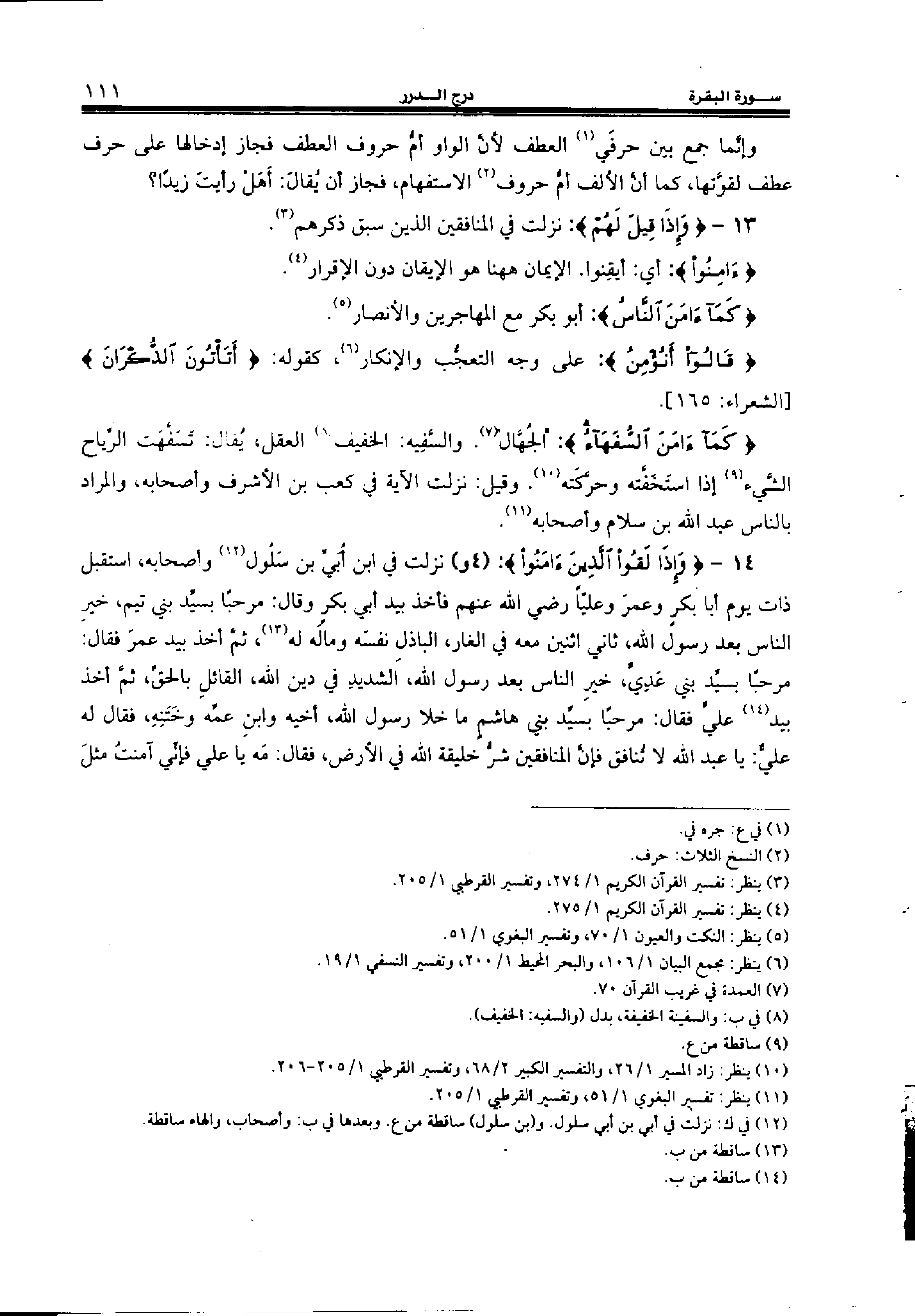 14 - {وَإِذا لَقُوا الَّذِينَ آمَنُوا:} (4 و) نزلت في ابن أبي بن سلول (¬12) وأصحابه، استقبل ذات يوم أبا بكر وعمر وعليّا رضي الله عنهم فأخذ بيد أبي بكر وقال: مرحبا بسيّد بني تيم، خير الناس بعد رسول الله، ثاني اثنين معه في الغار، الباذل نفسه وماله له (¬13)، ثمّ أخذ بيد عمر فقال: