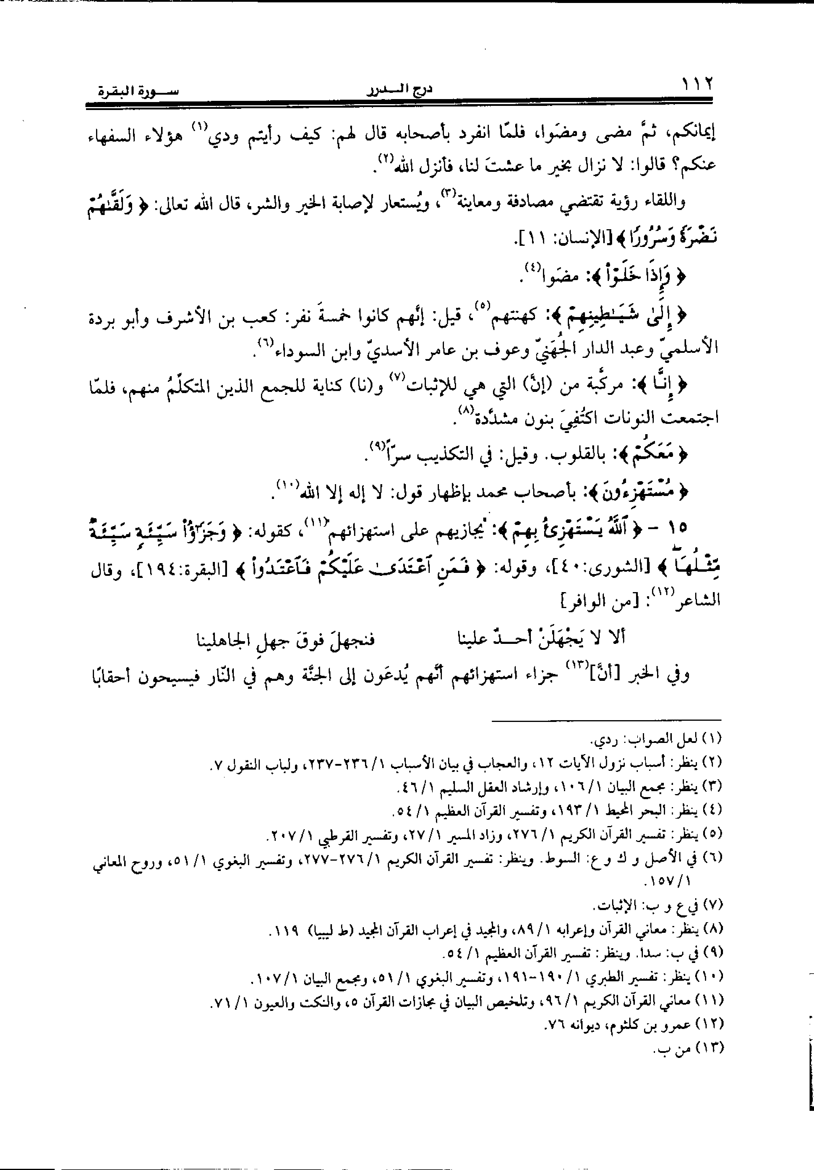 15 - {اللهُ يَسْتَهْزِئُ بِهِمْ:} "يجازيهم على استهزائهم" (¬11)، كقوله: {وَجَزاءُ سَيِّئَةٍ سَيِّئَةٌ مِثْلُها} [الشورى:40]، وقوله: {فَمَنِ اِعْتَدى عَلَيْكُمْ فَاعْتَدُوا} [البقرة:194]، وقال الشاعر (¬12): [من الوافر]