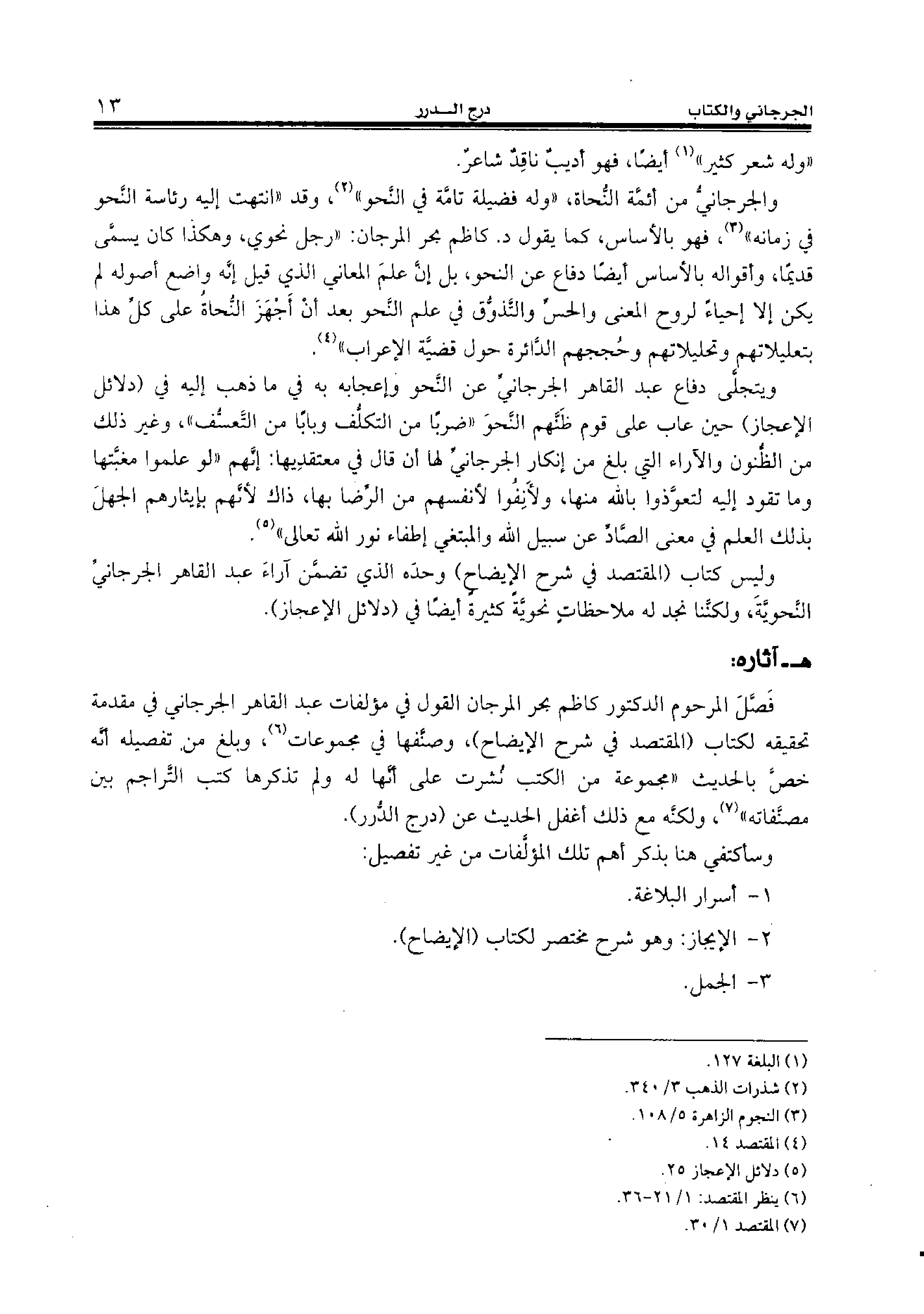 فصّل المرحوم الدكتور كاظم بحر المرجان القول في مؤلفات عبد القاهر الجرجاني في مقدمة تحقيقه لكتاب (المقتصد في شرح الإيضاح)، وصنّفها في مجموعات (¬6)، وبلغ من تفصيله أنّه خصّ بالحديث «مجموعة من الكتب نشرت على أنّها له ولم تذكرها كتب التّراجم بين مصنّفاته» (¬7)، ولكنّه مع ذلك أغفل الحديث عن (درج الدّرر).