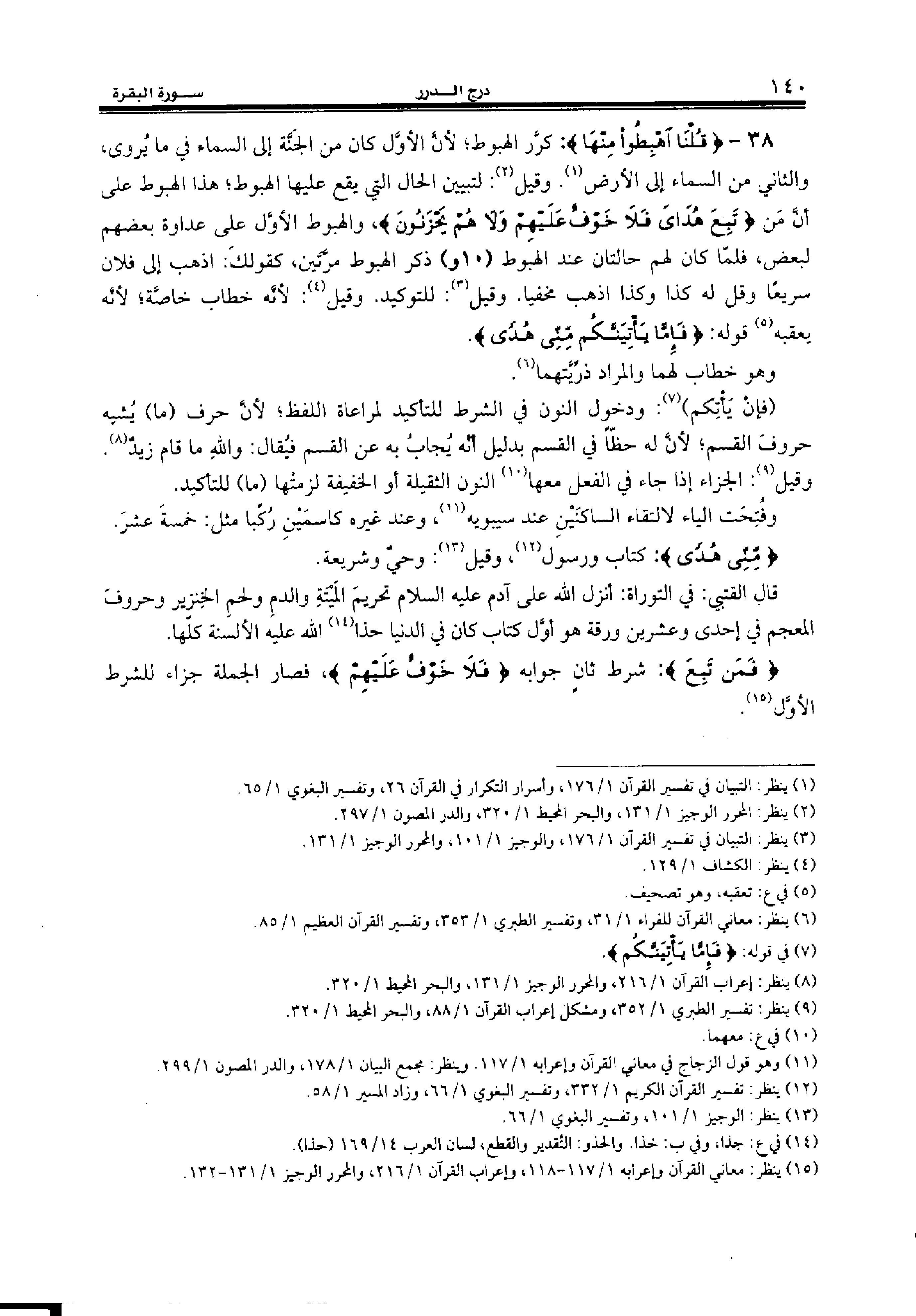 38 - {قُلْنَا اِهْبِطُوا مِنْها:} كرّر الهبوط؛ لأنّ الأوّل كان من الجنّة إلى السماء في ما يروى، والثاني من السماء إلى الأرض (¬1). وقيل (¬2): لتبيين الحال التي يقع عليها الهبوط؛ هذا الهبوط على أنّ من {تَبِعَ هُدايَ فَلا خَوْفٌ عَلَيْهِمْ وَلا هُمْ يَحْزَنُونَ،} والهبوط الأوّل على عداوة بعضهم لبعض، فلمّا كان لهم حالتان عند الهبوط (10 و) ذكر الهبوط مرّتين، كقولك: اذهب إلى فلان سريعا وقل له كذا وكذا اذهب مخفيا. وقيل (¬3): للتوكيد. وقيل (¬4): لأنّه خطاب خاصّة؛ لأنّه يعقبه (¬5) قوله: {فَإِمّا يَأْتِيَنَّكُمْ مِنِّي هُدىً.}