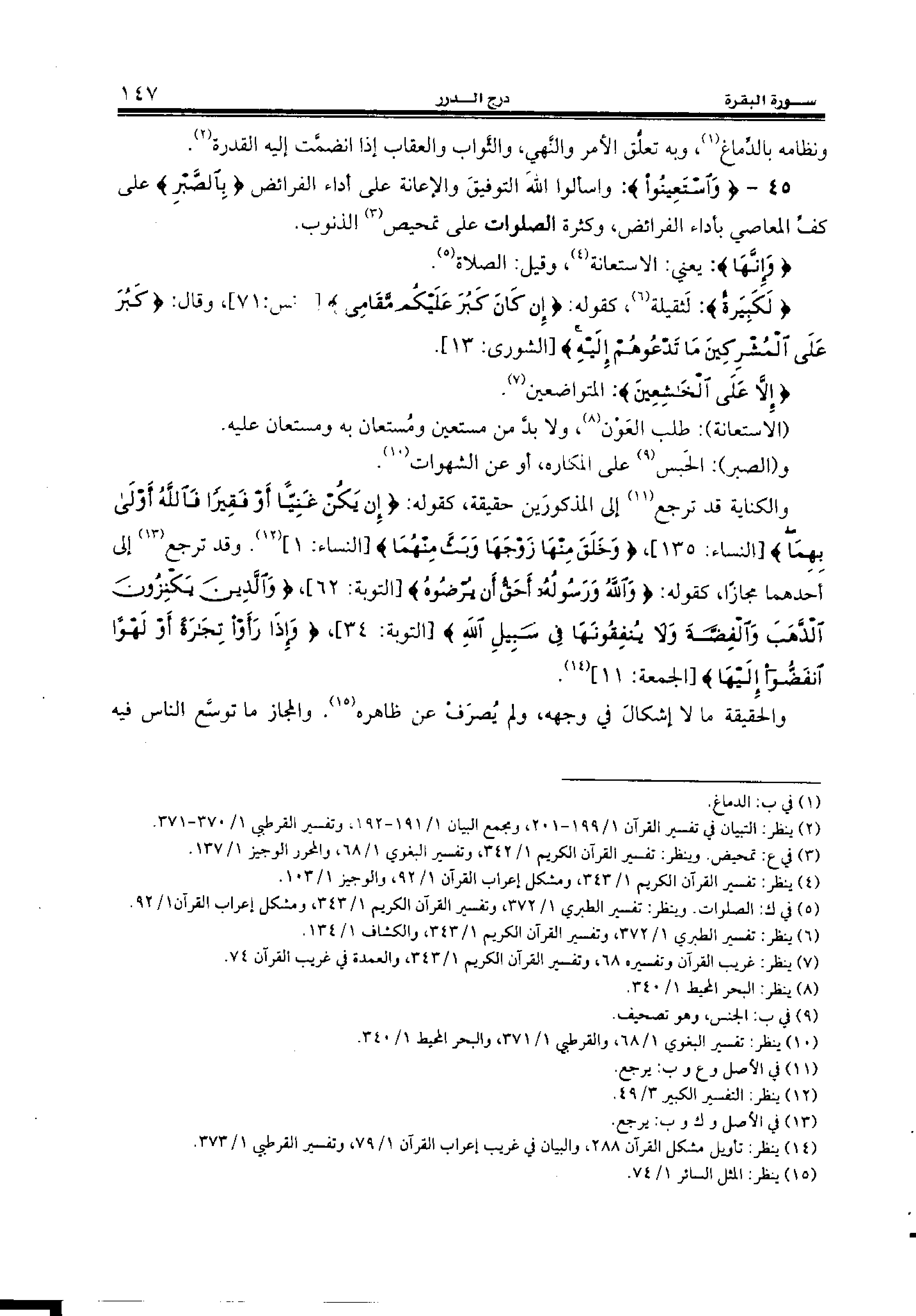 45 - {وَاِسْتَعِينُوا:} واسألوا الله التوفيق والإعانة على أداء الفرائض {بِالصَّبْرِ} على كفّ المعاصي بأداء الفرائض، وكثرة الصلوات على تمحيص (¬3) الذنوب.