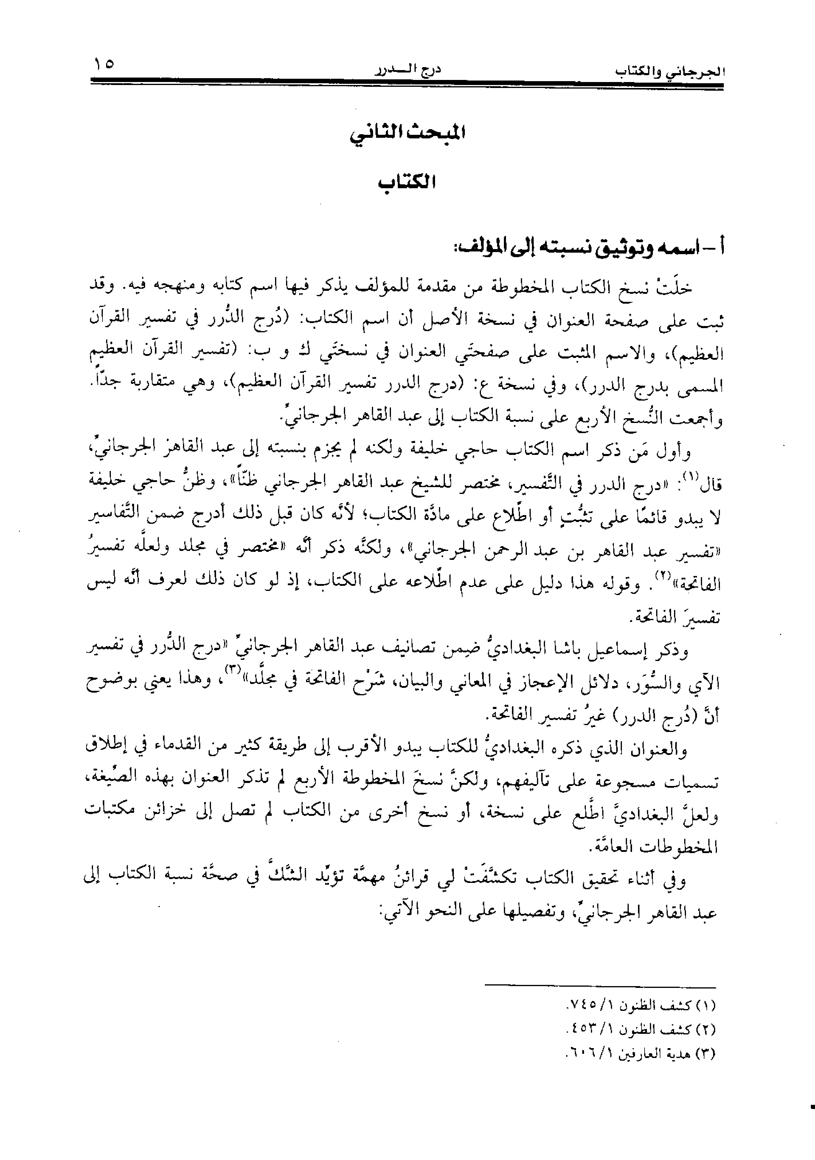 وأول من ذكر اسم الكتاب حاجي خليفة ولكنه لم يجزم بنسبته إلى عبد القاهر الجرجانيّ، قال (¬1): «درج الدرر في التّفسير، مختصر للشيخ عبد القاهر الجرجاني ظنّا»، وظنّ حاجي خليفة لا يبدو قائما على تثبّت أو اطّلاع على مادّة الكتاب؛ لأنّه كان قبل ذلك أدرج ضمن التّفاسير «تفسير عبد القاهر بن عبد الرحمن الجرجاني»، ولكنّه ذكر أنّه «مختصر في مجلد ولعلّه تفسير الفاتحة» (¬2). وقوله هذا دليل على عدم اطّلاعه على الكتاب، إذ لو كان ذلك لعرف أنّه ليس تفسير الفاتحة.