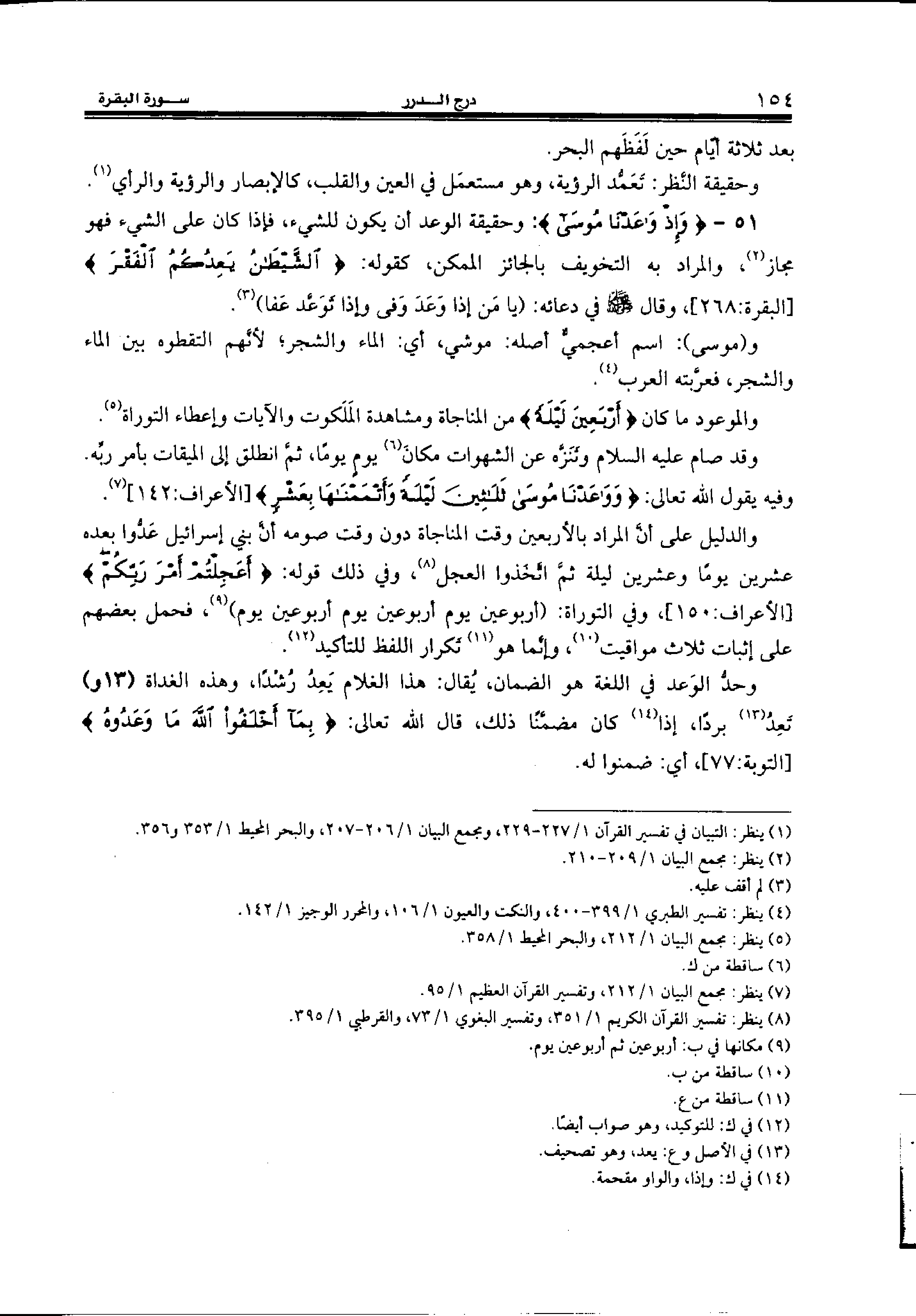 51 - {وَإِذْ واعَدْنا مُوسى:} وحقيقة الوعد أن يكون للشيء، فإذا كان على الشيء فهو مجاز (¬2)، والمراد به التخويف بالجائز الممكن، كقوله: {الشَّيْطانُ يَعِدُكُمُ الْفَقْرَ} [البقرة:268]، وقال صلّى الله عليه وسلّم في دعائه: (يا من إذا وعد وفى وإذا توعّد عفا) (¬3).