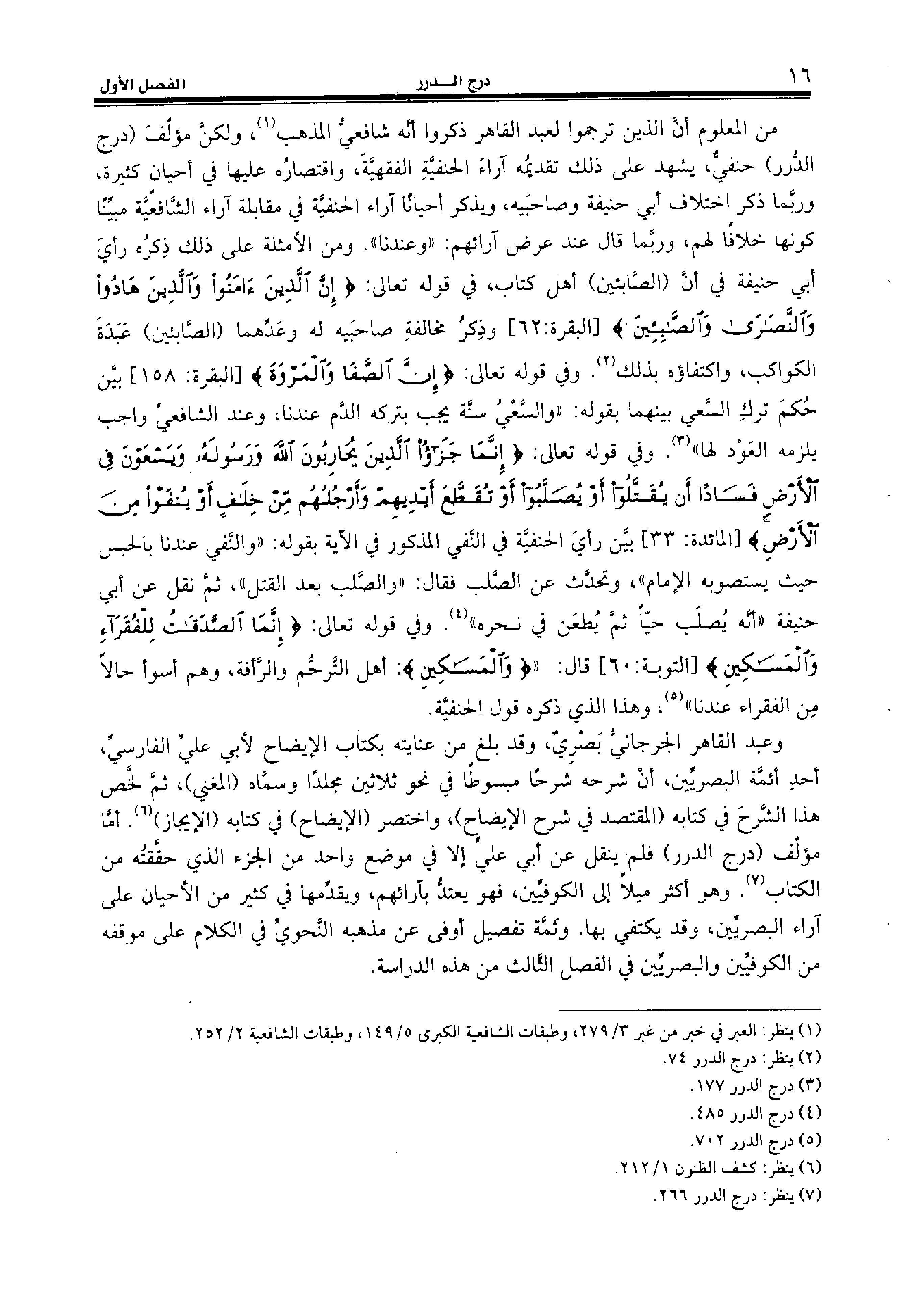 من المعلوم أنّ الذين ترجموا لعبد القاهر ذكروا أنّه شافعيّ المذهب (¬1)، ولكنّ مؤلّف (درج الدّرر) حنفيّ، يشهد على ذلك تقديمه آراء الحنفيّة الفقهيّة، واقتصاره عليها في أحيان كثيرة، وربّما ذكر اختلاف أبي حنيفة وصاحبيه، ويذكر أحيانا آراء الحنفيّة في مقابلة آراء الشّافعيّة مبيّنا كونها خلافا لهم، وربّما قال عند عرض آرائهم: «وعندنا». ومن الأمثلة على ذلك ذكره رأي أبي حنيفة في أنّ (الصّابئين) أهل كتاب، في قوله تعالى: {إِنَّ الَّذِينَ آمَنُوا وَالَّذِينَ هادُوا وَالنَّصارى وَالصّابِئِينَ} [البقرة:62] وذكر مخالفة صاحبيه له وعدّهما (الصّابئين) عبدة الكواكب، واكتفاؤه بذلك (¬2). وفي قوله تعالى: {إِنَّ الصَّفا وَالْمَرْوَةَ} [البقرة:158] بيّن حكم ترك السّعي بينهما بقوله: «والسّعي سنّة يجب بتركه الدّم عندنا، وعند الشافعيّ واجب يلزمه العود لها» (¬3). وفي قوله تعالى: {إِنَّما جَزاءُ الَّذِينَ يُحارِبُونَ اللهَ وَرَسُولَهُ وَيَسْعَوْنَ فِي الْأَرْضِ فَساداً أَنْ يُقَتَّلُوا أَوْ يُصَلَّبُوا أَوْ تُقَطَّعَ أَيْدِيهِمْ وَأَرْجُلُهُمْ مِنْ خِلافٍ أَوْ يُنْفَوْا مِنَ الْأَرْضِ} [المائدة:33] بيّن رأي الحنفيّة في النّفي المذكور في الآية بقوله: «والنّفي عندنا بالحبس حيث يستصوبه الإمام»، وتحدّث عن الصّلب فقال: «والصّلب بعد القتل»، ثمّ نقل عن أبي حنيفة «أنّه يصلب حيّا ثمّ يطعن في نحره» (¬4). وفي قوله تعالى: {إِنَّمَا الصَّدَقاتُ لِلْفُقَراءِ وَالْمَساكِينِ} [التوبة:60] قال: {وَالْمَساكِينِ:} أهل التّرحّم والرّأفة، وهم أسوأ حالا من الفقراء عندنا» (¬5)، وهذا الذي ذكره قول الحنفيّة.