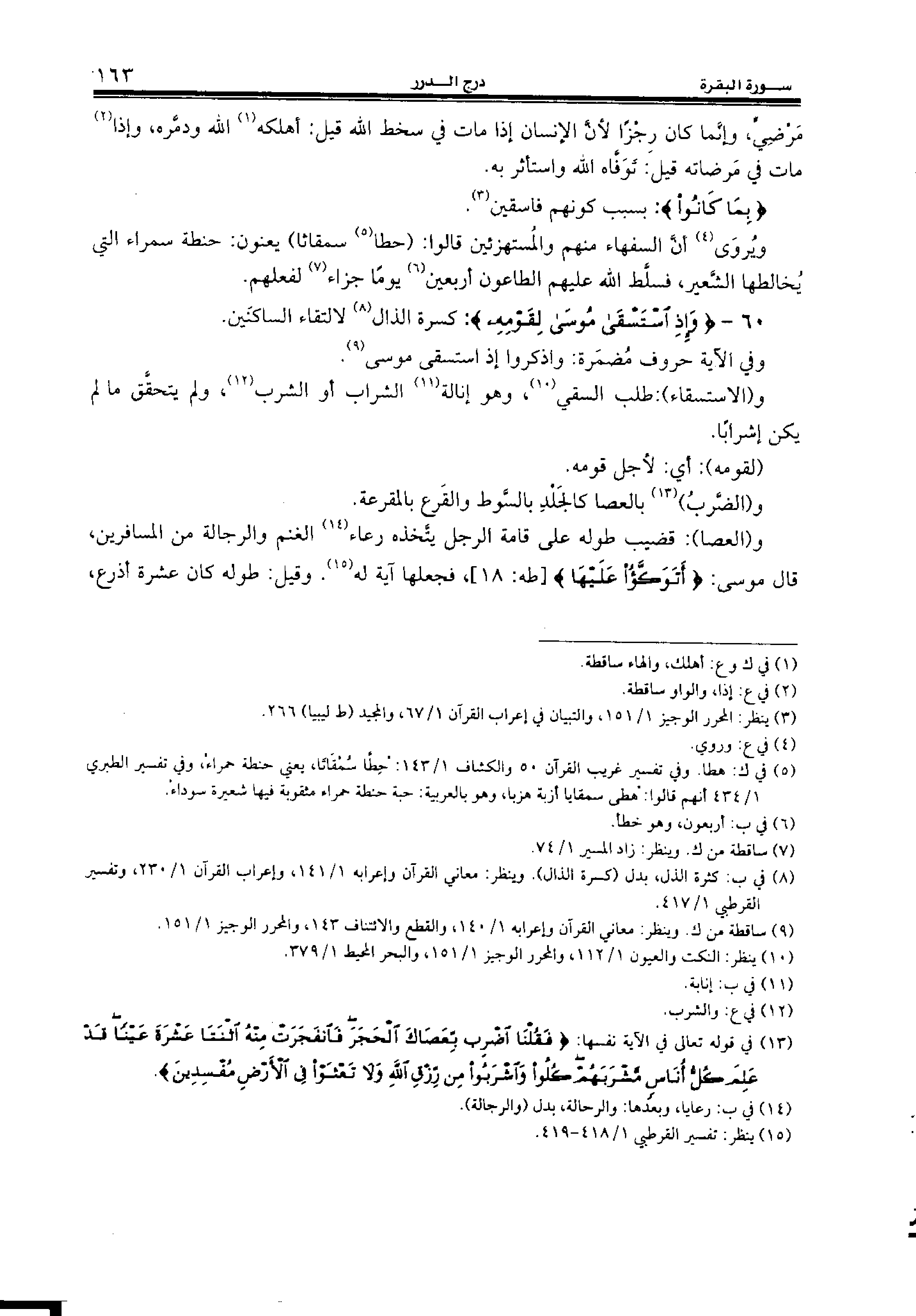 (¬13) في قوله تعالى في الآية نفسها: فَقُلْنَا اِضْرِبْ بِعَصاكَ الْحَجَرَ فَانْفَجَرَتْ مِنْهُ اِثْنَتا عَشْرَةَ عَيْناً قَدْ عَلِمَ كُلُّ أُناسٍ مَشْرَبَهُمْ كُلُوا وَاِشْرَبُوا مِنْ رِزْقِ اللهِ وَلا تَعْثَوْا فِي الْأَرْضِ مُفْسِدِينَ.