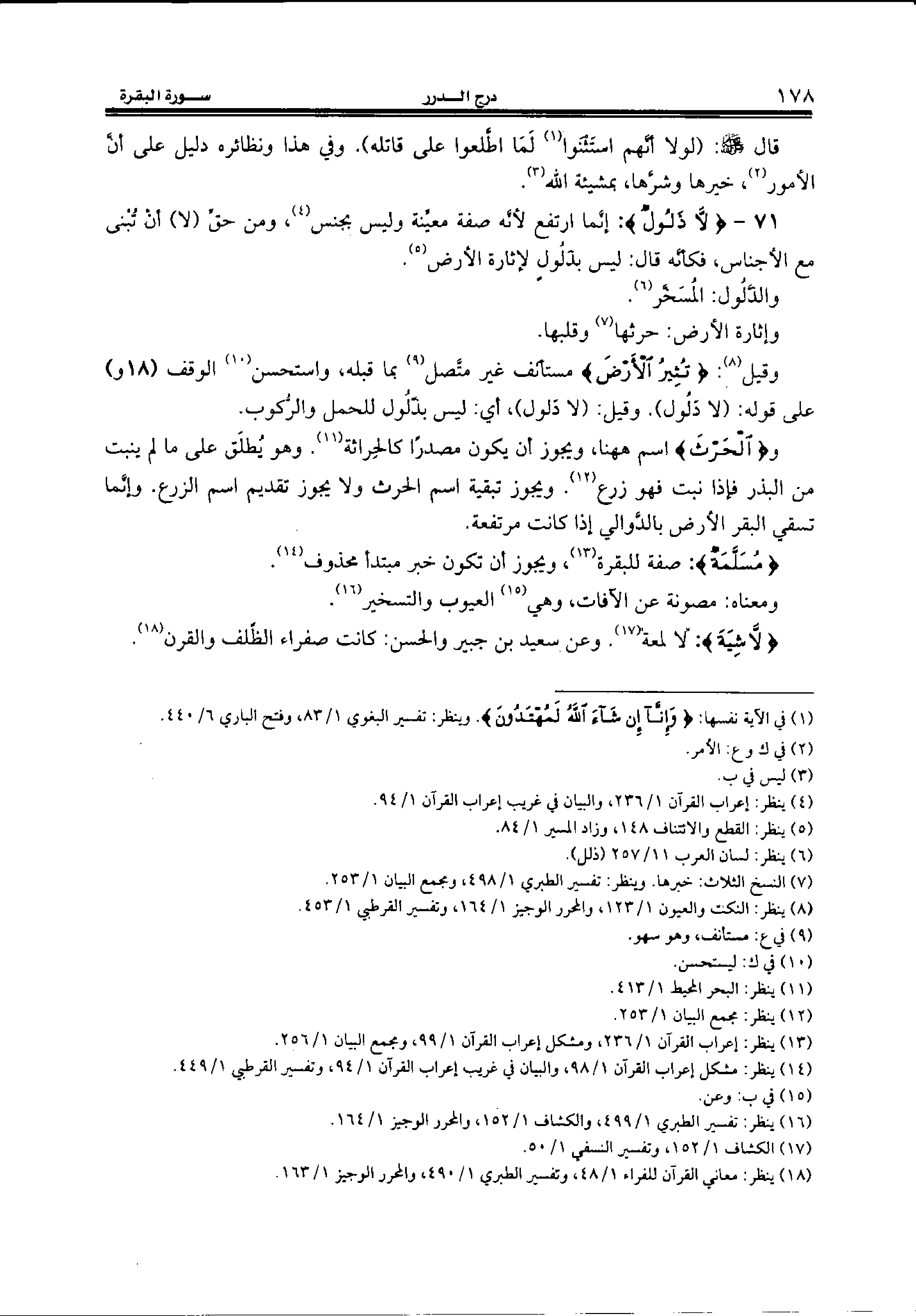 71 - {لا ذَلُولٌ:} إنّما ارتفع لأنّه صفة معيّنة وليس بجنس (¬4)، ومن حقّ (لا) أن تبنى مع الأجناس، فكأنّه قال: ليس بذلول لإثارة الأرض (¬5).