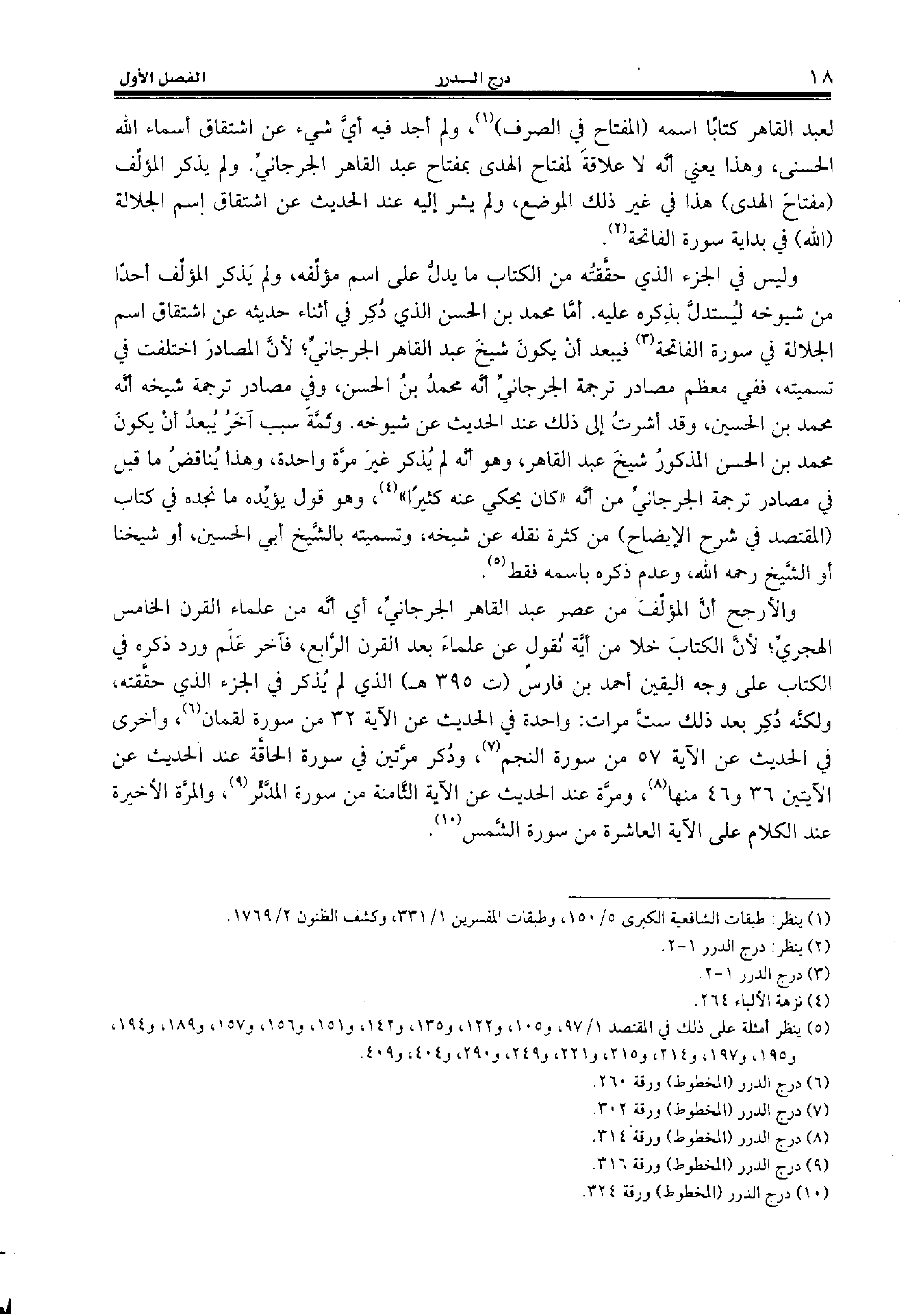 لعبد القاهر كتابا اسمه (المفتاح في الصرف) (¬1)، ولم أجد فيه أيّ شيء عن اشتقاق أسماء الله الحسنى، وهذا يعني أنّه لا علاقة لمفتاح الهدى بمفتاح عبد القاهر الجرجانيّ. ولم يذكر المؤلّف (مفتاح الهدى) هذا في غير ذلك الموضع، ولم يشر إليه عند الحديث عن اشتقاق اسم الجلالة (الله) في بداية سورة الفاتحة (¬2).