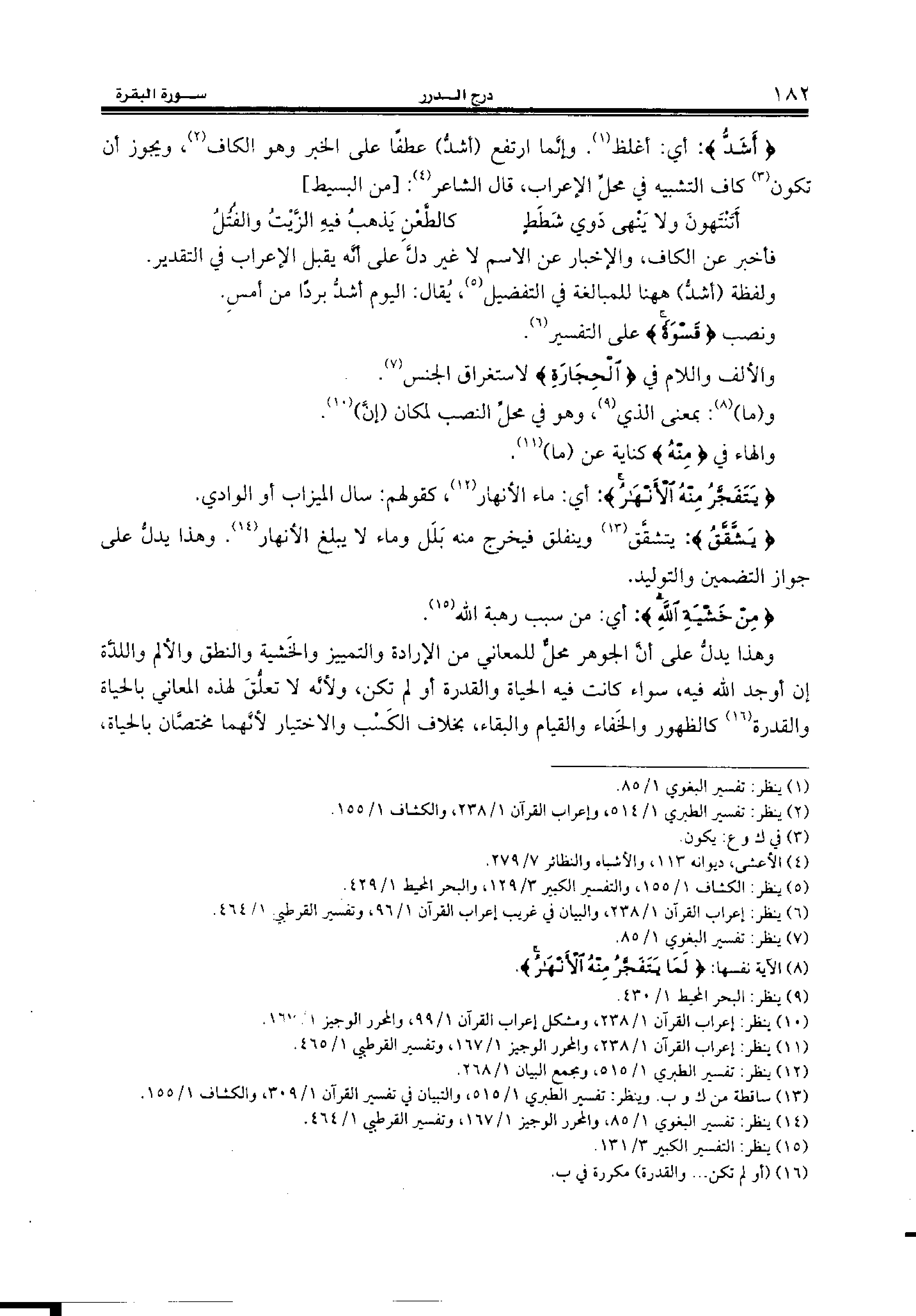 {أَشَدُّ:} أي: أغلظ (¬1). وإنّما ارتفع (أشدّ) عطفا على الخبر وهو الكاف (¬2)، ويجوز أن تكون (¬3) كاف التشبيه في محلّ الإعراب، قال الشاعر (¬4): [من البسيط]