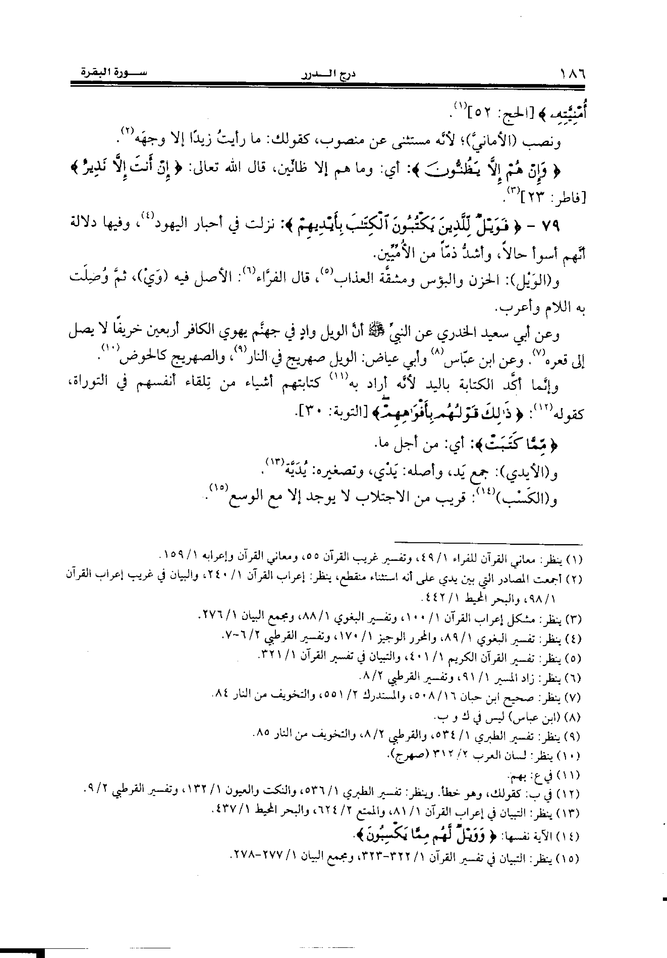 79 - {فَوَيْلٌ لِلَّذِينَ يَكْتُبُونَ الْكِتابَ بِأَيْدِيهِمْ:} نزلت في أحبار اليهود (¬4)، وفيها دلالة أنّهم أسوأ حالا، وأشدّ ذمّا من الأمّيّين.