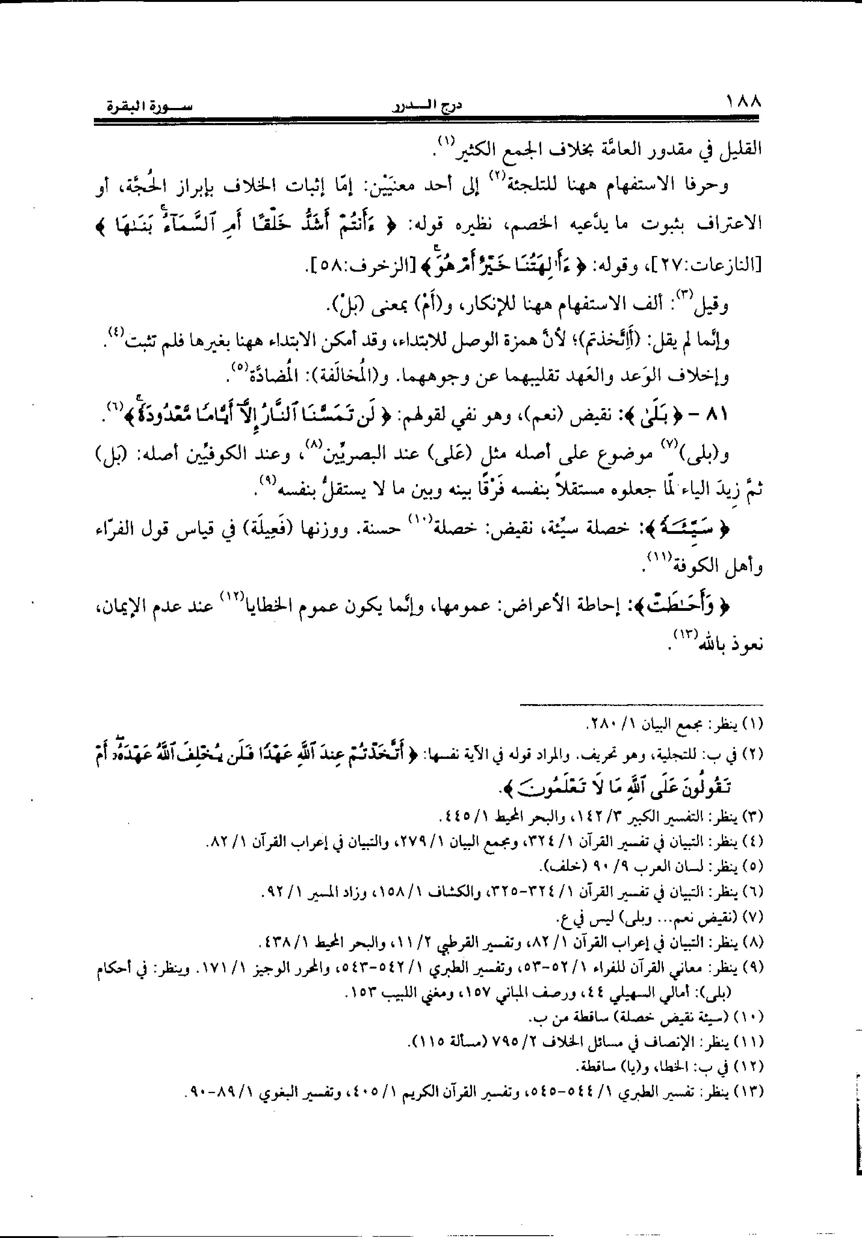 (¬9) ينظر: معاني القرآن للفراء 1/ 52 - 53، وتفسير الطبري 1/ 542 - 543، والمحرر الوجيز 1/ 171. وينظر: في أحكام (بلى): أمالي السهيلي 44، ورصف المباني 157، ومغني اللبيب 153.