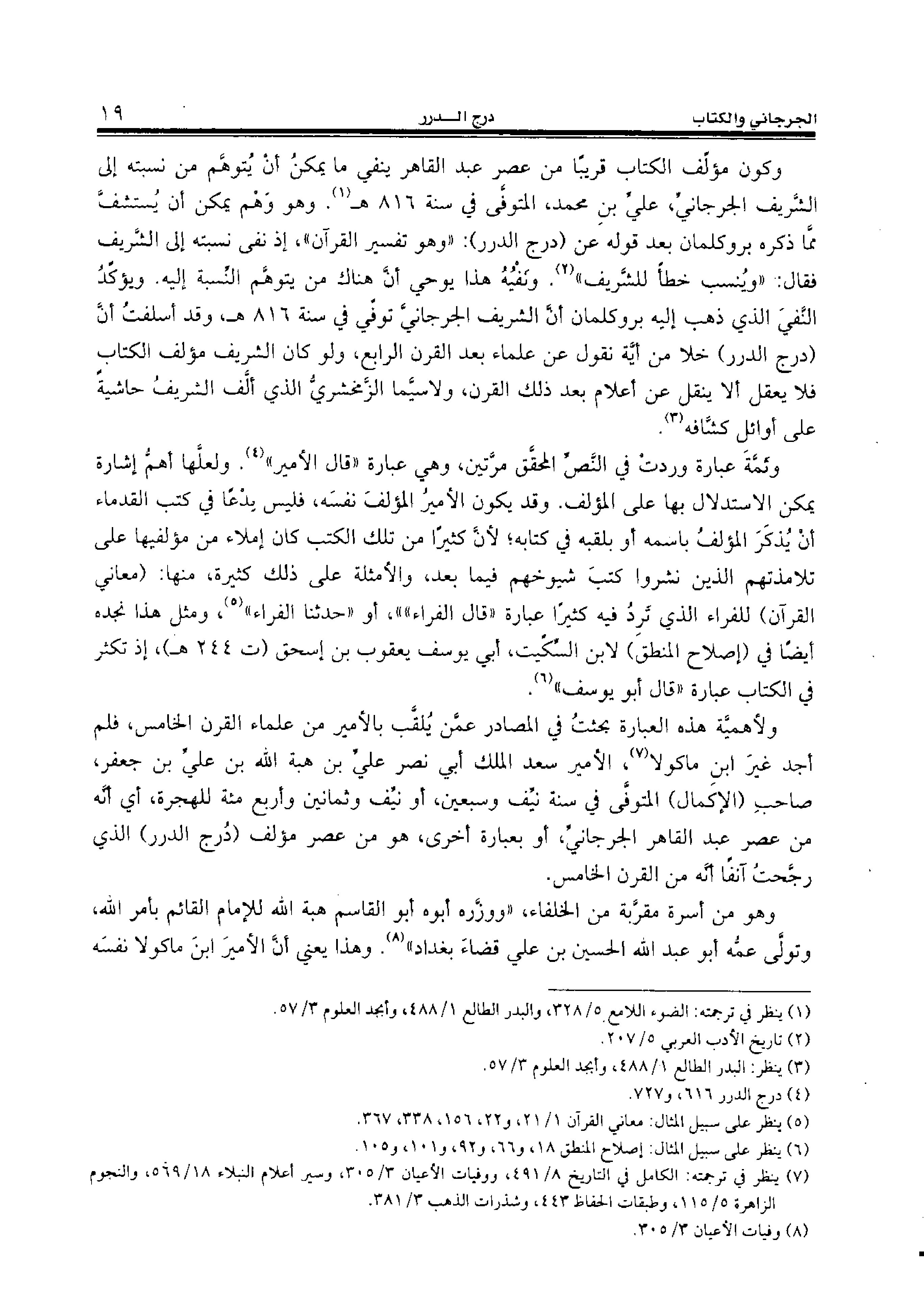 وكون مؤلّف الكتاب قريبا من عصر عبد القاهر ينفي ما يمكن أن يتوهّم من نسبته إلى الشّريف الجرجانيّ، عليّ بن محمد، المتوفّى في سنة 816 هـ (¬1). وهو وهم يمكن أن يستشفّ ممّا ذكره بروكلمان بعد قوله عن (درج الدرر): «وهو تفسير القرآن»، إذ نفى نسبته إلى الشّريف فقال: «وينسب خطأ للشّريف» (¬2). ونفيه هذا يوحي أنّ هناك من يتوهّم النّسبة إليه. ويؤكّد النّفي الذي ذهب إليه بروكلمان أنّ الشريف الجرجانيّ توفّي في سنة 816 هـ، وقد أسلفت أنّ (درج الدرر) خلا من أيّة نقول عن علماء بعد القرن الرابع، ولو كان الشريف مؤلف الكتاب فلا يعقل ألا ينقل عن أعلام بعد ذلك القرن، ولا سيّما الزّمخشريّ الذي ألّف الشريف حاشية على أوائل كشّافه (¬3).