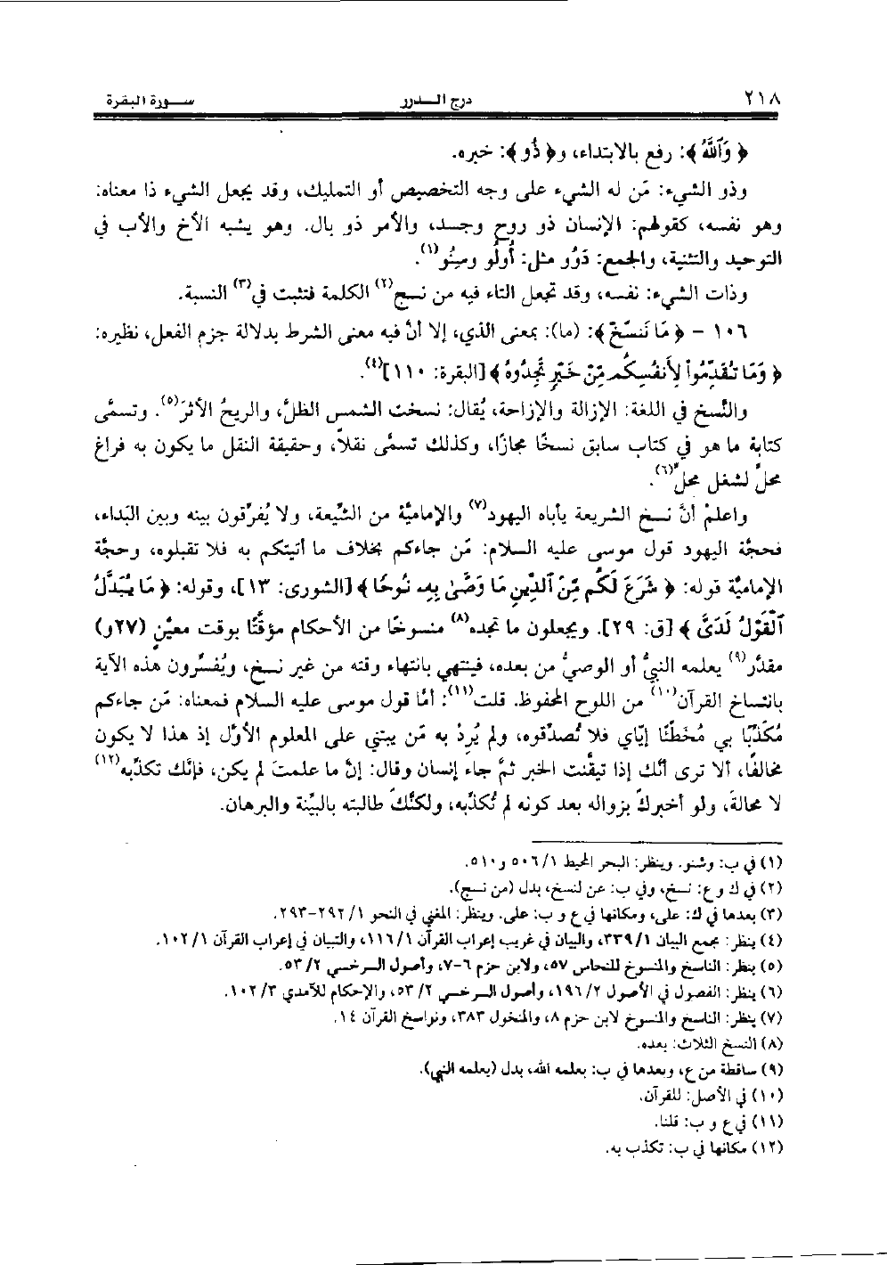 واعلم أنّ نسخ الشريعة يأباه اليهود (¬7) والإماميّة من الشّيعة، ولا يفرّقون بينه وبين البداء، فحجّة اليهود قول موسى عليه السّلام: من جاءكم بخلاف ما أتيتكم به فلا تقبلوه، وحجّة الإماميّة قوله: {شَرَعَ لَكُمْ مِنَ الدِّينِ ما وَصّى بِهِ نُوحاً} [الشورى:13]، وقوله: {ما يُبَدَّلُ الْقَوْلُ لَدَيَّ} [ق:29]. ويجعلون ما تجده (¬8) منسوخا من الأحكام مؤقّتا بوقت معيّن (27 و) مقدّر (¬9) يعلمه النبيّ أو الوصيّ من بعده، فينتهي بانتهاء وقته من غير نسخ، ويفسّرون هذه الآية بانتساخ القرآن (¬10) من اللوح المحفوظ. قلت (¬11): أمّا قول موسى عليه السّلام فمعناه: من جاءكم مكذّبا بي مخطّئا إيّاي فلا تصدّقوه، ولم يرد به من يبتني على المعلوم الأوّل إذ هذا لا يكون مخالفا، ألا ترى أنّك إذا تيقّنت الخبر ثمّ جاء إنسان وقال: إنّ ما علمت لم يكن، فإنّك تكذّبه (¬12) لا محالة، ولو أخبرك بزواله بعد كونه لم تكذّبه، ولكنّك طالبته بالبيّنة والبرهان.