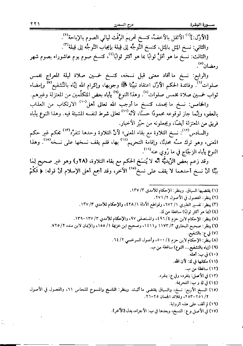 (¬15) النسخ الأربع: نسخ، والسياق يقتضي ما أثبت. وينظر: الناسخ والمنسوخ للنحاس 61، والفصول في الأصول 2/ 251 - 253، وقلائد الجمان 25 - 26.