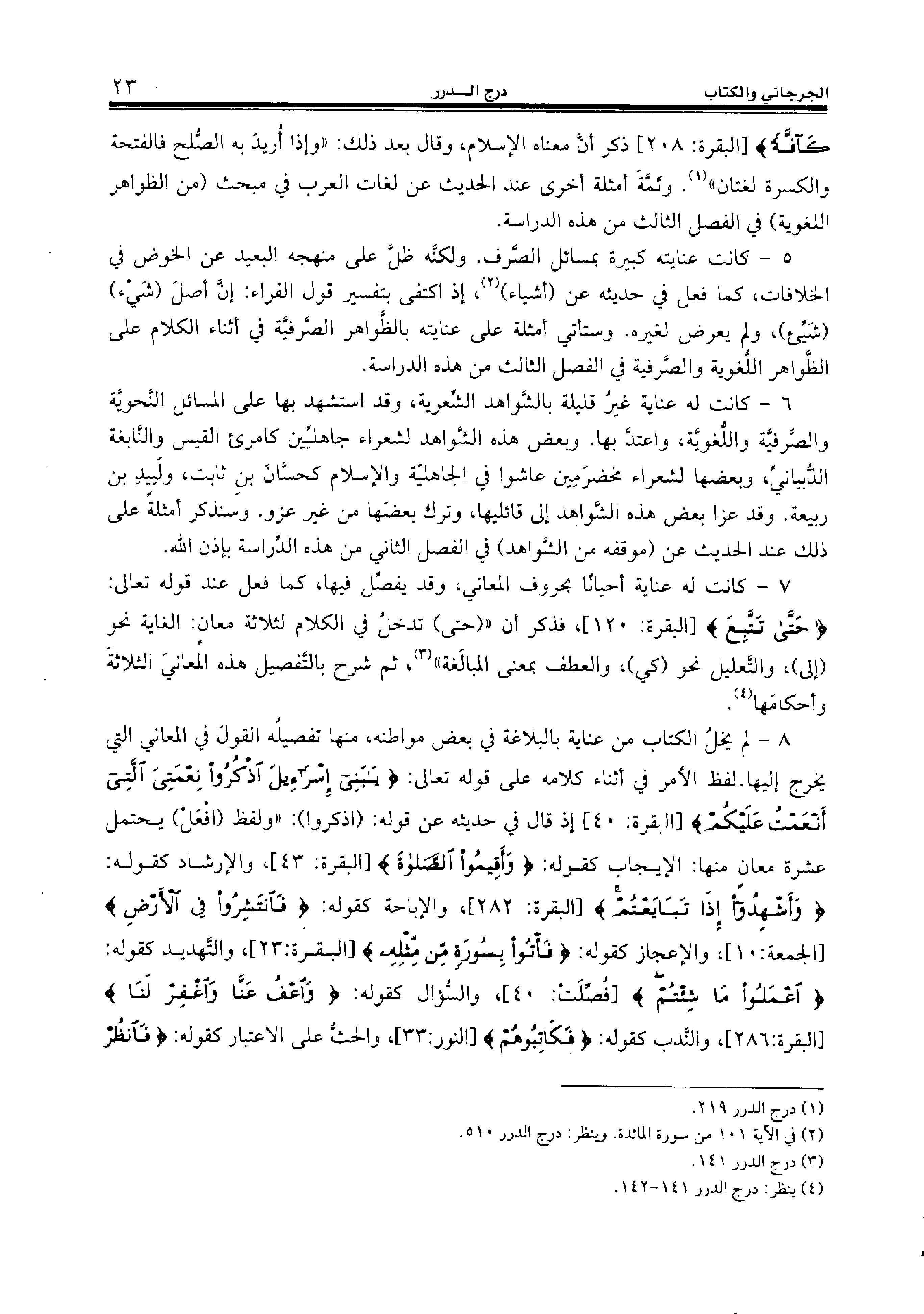 {كَافَّةً} [البقرة:208] ذكر أنّ معناه الإسلام، وقال بعد ذلك: «وإذا أريد به الصّلح فالفتحة والكسرة لغتان» (¬1). وثمّة أمثلة أخرى عند الحديث عن لغات العرب في مبحث (من الظواهر اللغوية) في الفصل الثالث من هذه الدراسة.