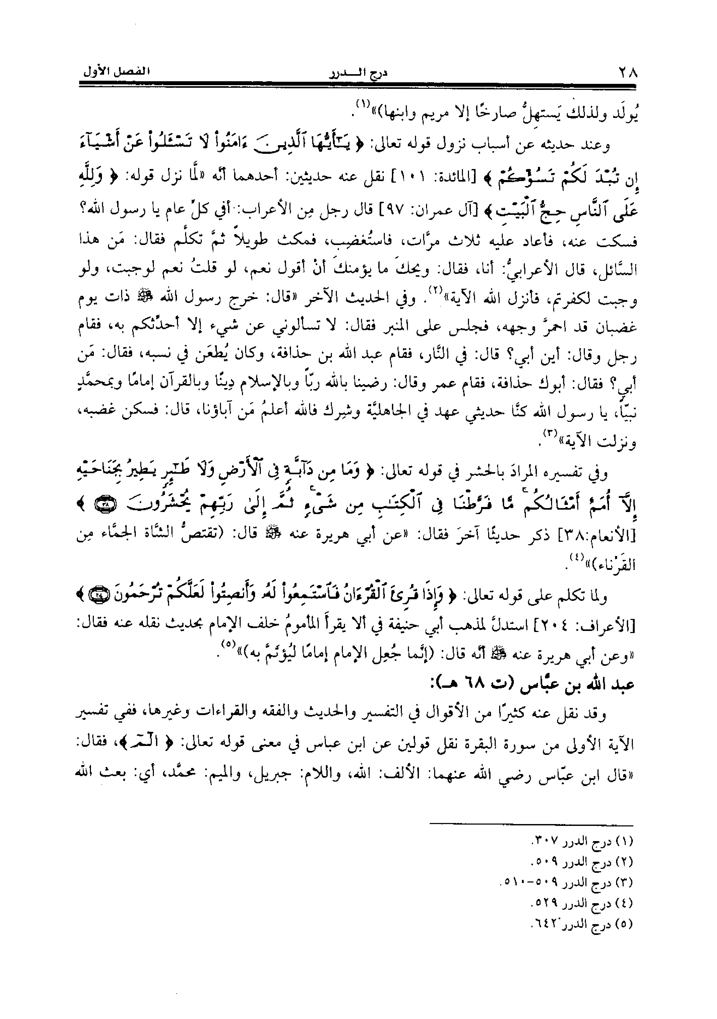 وعند حديثه عن أسباب نزول قوله تعالى: {يا أَيُّهَا الَّذِينَ آمَنُوا لا تَسْئَلُوا عَنْ أَشْياءَ إِنْ تُبْدَ لَكُمْ تَسُؤْكُمْ} [المائدة:101] نقل عنه حديثين: أحدهما أنّه «لمّا نزل قوله: {وَلِلّهِ عَلَى النّاسِ حِجُّ الْبَيْتِ} [آل عمران:97] قال رجل من الأعراب: أفي كلّ عام يا رسول الله؟ فسكت عنه، فأعاد عليه ثلاث مرّات، فاستغضب، فمكث طويلا ثمّ تكلّم فقال: من هذا السّائل، قال الأعرابيّ: أنا، فقال: ويحك ما يؤمنك أن أقول نعم، لو قلت نعم لوجبت، ولو وجبت لكفرتم، فأنزل الله الآية» (¬2). وفي الحديث الآخر «قال: خرج رسول الله صلّى الله عليه وسلّم ذات يوم غضبان قد احمرّ وجهه، فجلس على المنبر فقال: لا تسألوني عن شيء إلا أحدّثكم به، فقام رجل وقال: أين أبي؟ قال: في النّار، فقام عبد الله بن حذافة، وكان يطعن في نسبه، فقال: من أبي؟ فقال: أبوك حذافة، فقام عمر وقال: رضينا بالله ربّا وبالإسلام دينا وبالقرآن إماما وبمحمّد نبيّا، يا رسول الله كنّا حديثي عهد في الجاهليّة وشرك فالله أعلم من آباؤنا، قال: فسكن غضبه، ونزلت الآية» (¬3).