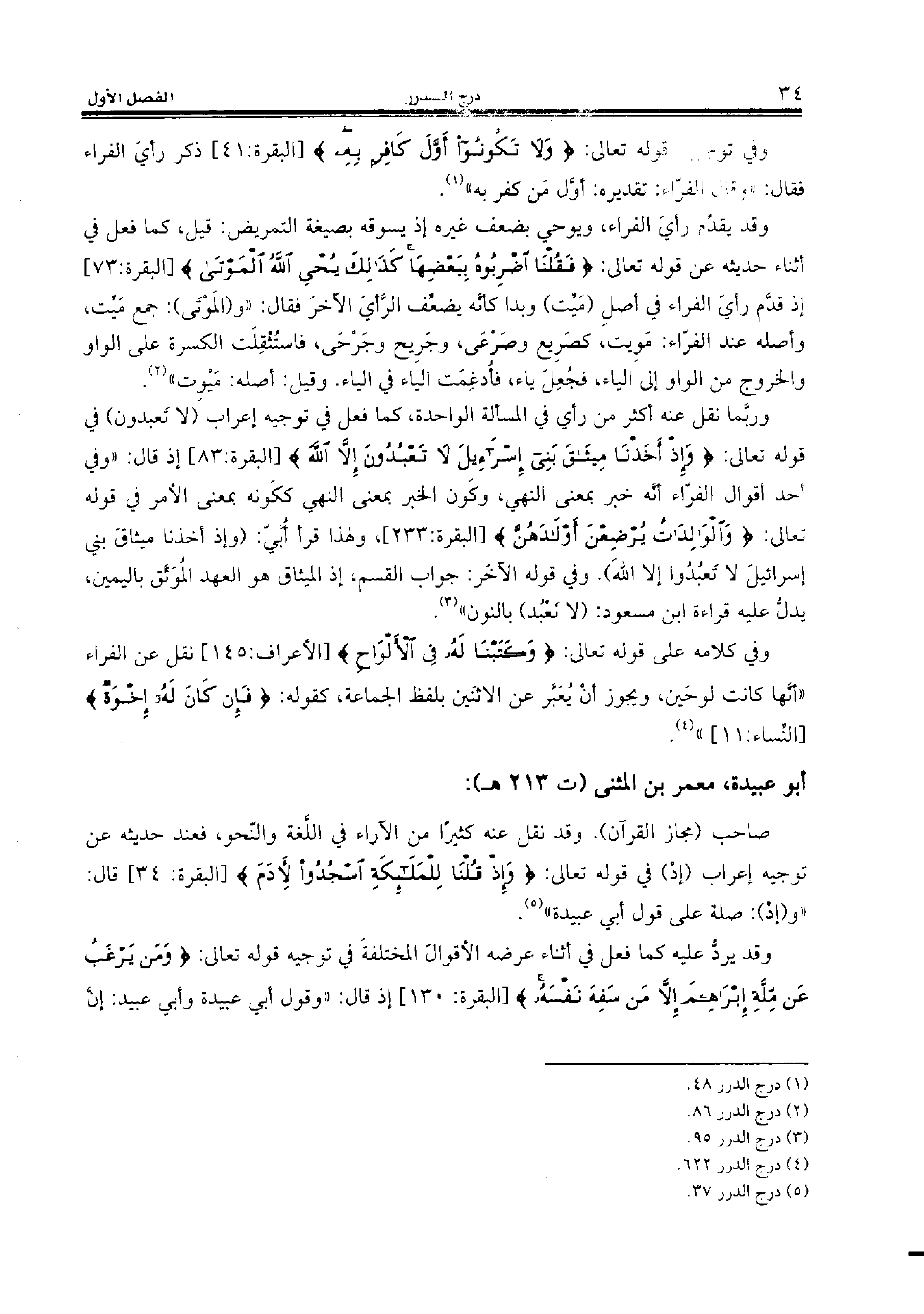 وفي توجيه قوله تعالى: {وَلا تَكُونُوا أَوَّلَ كافِرٍ بِهِ} [البقرة:41] ذكر رأي الفراء فقال: «وقال الفرّاء: تقديره: أوّل من كفر به» (¬1).