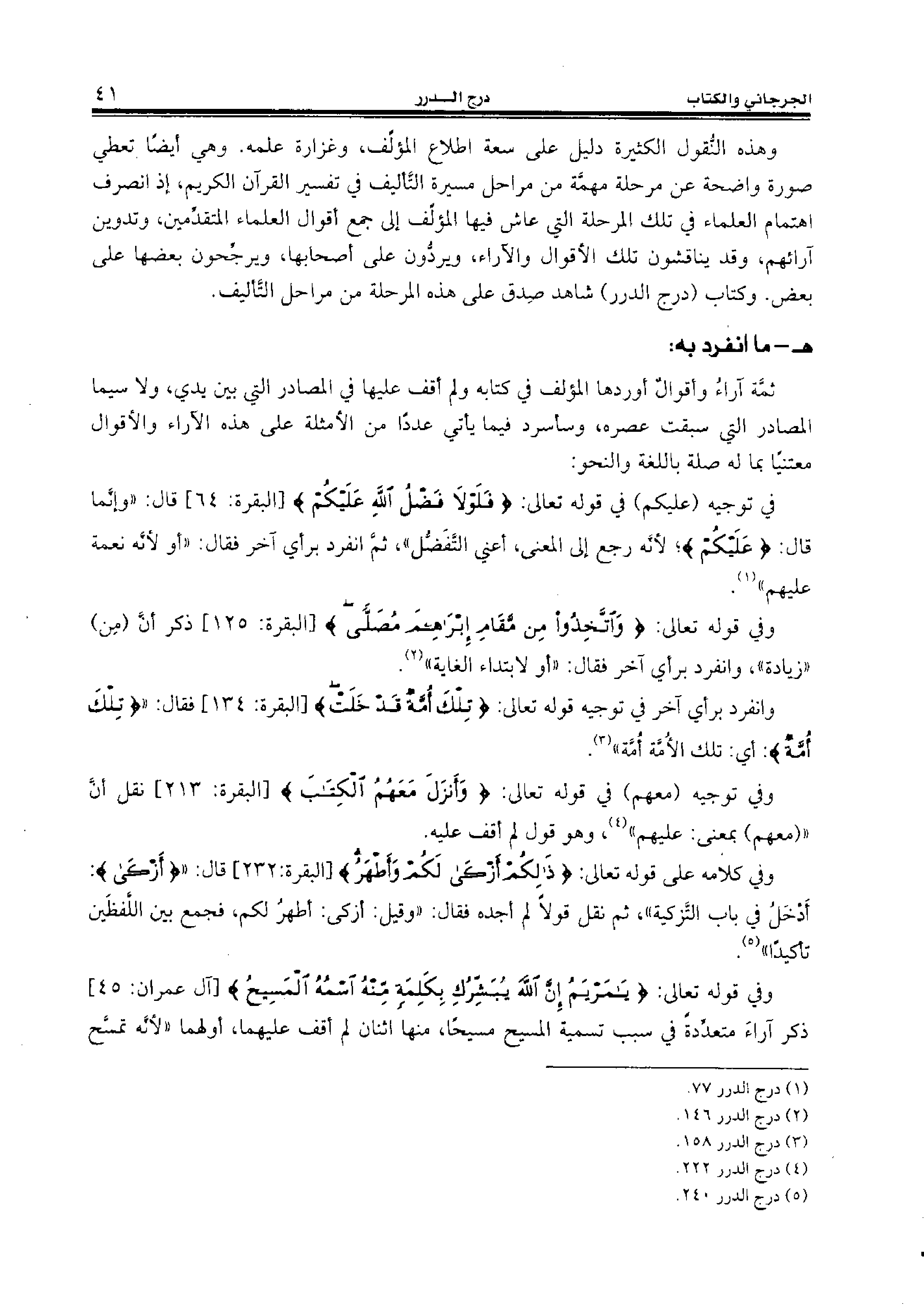 وهذه النّقول الكثيرة دليل على سعة اطلاع المؤلّف، وغزارة علمه. وهي أيضا تعطي صورة واضحة عن مرحلة مهمّة من مراحل مسيرة التّأليف في تفسير القرآن الكريم، إذ انصرف اهتمام العلماء في تلك المرحلة التي عاش فيها المؤلّف إلى جمع أقوال العلماء المتقدّمين، وتدوين آرائهم، وقد يناقشون تلك الأقوال والآراء، ويردّون على أصحابها، ويرجّحون بعضها على بعض. وكتاب (درج الدرر) شاهد صدق على هذه المرحلة من مراحل التّأليف.