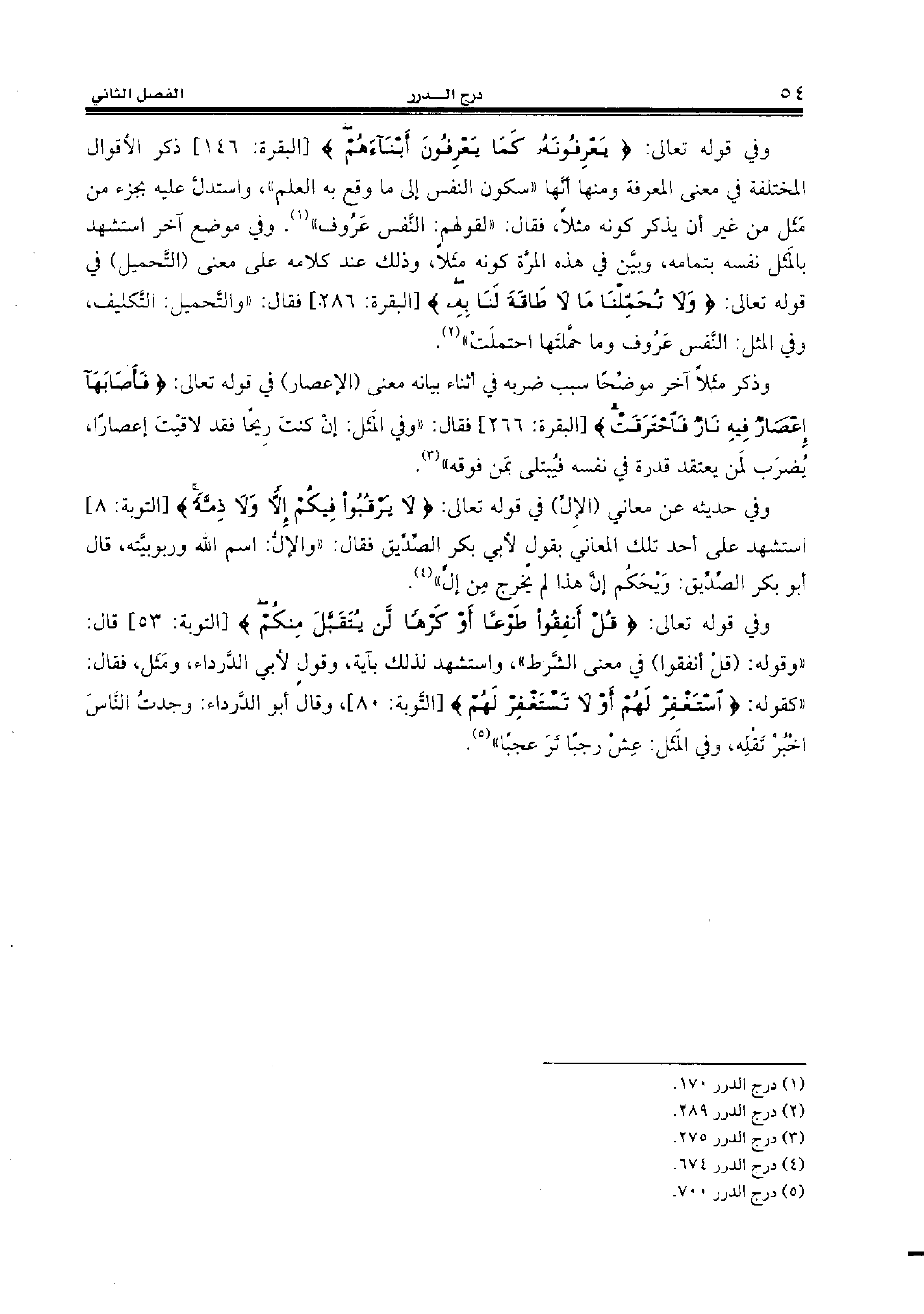 وفي قوله تعالى: {يَعْرِفُونَهُ كَما يَعْرِفُونَ أَبْناءَهُمْ} [البقرة:146] ذكر الأقوال المختلفة في معنى المعرفة ومنها أنّها «سكون النفس إلى ما وقع به العلم»، واستدلّ عليه بجزء من مثل من غير أن يذكر كونه مثلا، فقال: «لقولهم: النّفس عروف» (¬1). وفي موضع آخر استشهد بالمثل نفسه بتمامه، وبيّن في هذه المرّة كونه مثلا، وذلك عند كلامه على معنى (التّحميل) في قوله تعالى: {وَلا تُحَمِّلْنا ما لا طاقَةَ لَنا بِهِ} [البقرة:286] فقال: «والتّحميل: التّكليف، وفي المثل: النّفس عروف وما حمّلتها احتملت» (¬2).