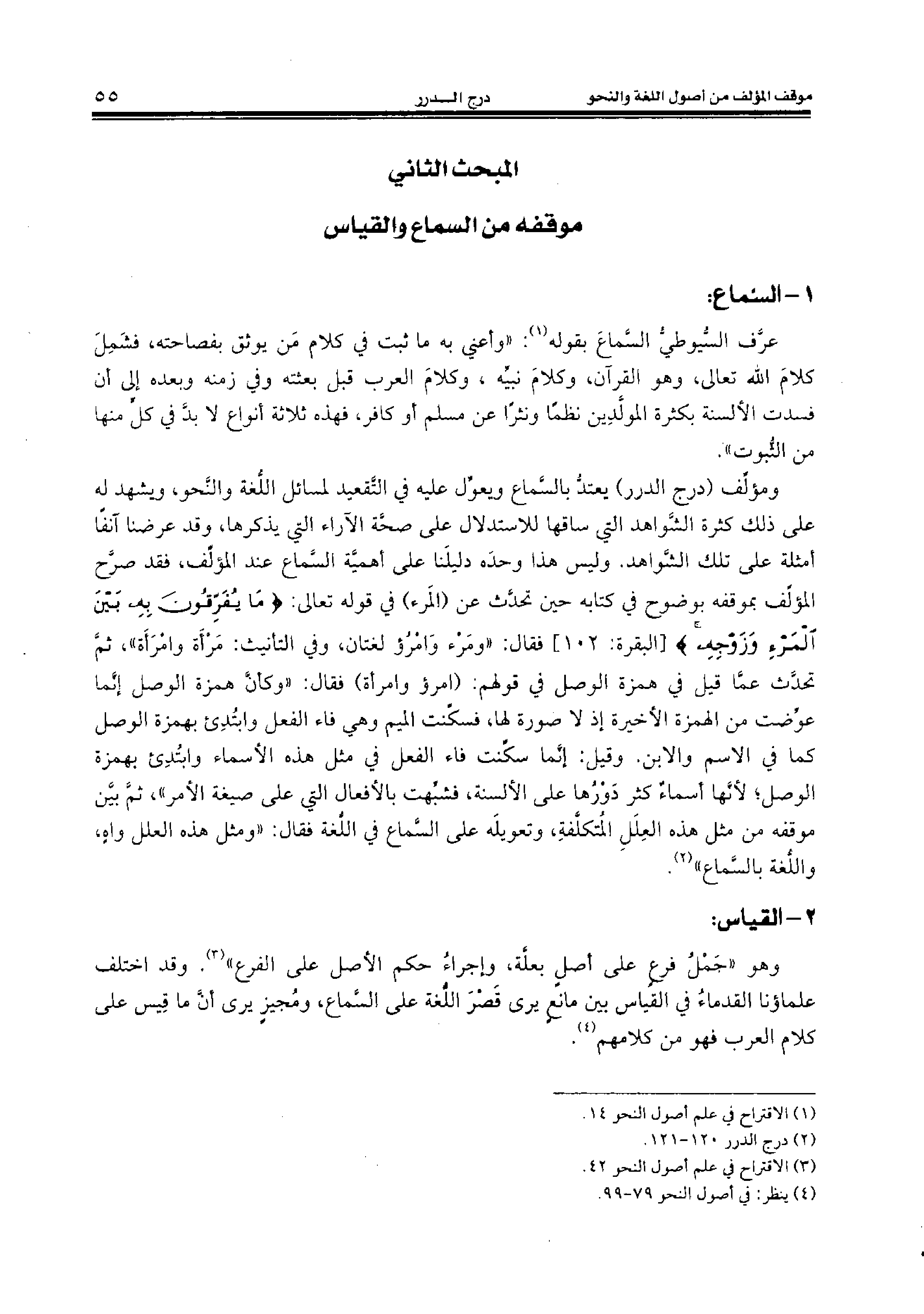 ومؤلّف (درج الدرر) يعتدّ بالسّماع ويعوّل عليه في التّقعيد لمسائل اللّغة والنّحو، ويشهد له على ذلك كثرة الشّواهد التي ساقها للاستدلال على صحّة الآراء التي يذكرها، وقد عرضنا آنفا أمثلة على تلك الشّواهد. وليس هذا وحده دليلنا على أهميّة السّماع عند المؤلّف، فقد صرّح المؤلّف بموقفه بوضوح في كتابه حين تحدّث عن (المرء) في قوله تعالى: {ما يُفَرِّقُونَ بِهِ بَيْنَ الْمَرْءِ وَزَوْجِهِ} [البقرة:102] فقال: «ومرء وامرؤ لغتان، وفي التأنيث: مرأة وامرأة»، ثمّ تحدّث عمّا قيل في همزة الوصل في قولهم: (امرؤ وامرأة) فقال: «وكأنّ همزة الوصل إنّما عوّضت من الهمزة الأخيرة إذ لا صورة لها، فسكّنت الميم وهي فاء الفعل وابتدئ بهمزة الوصل كما في الاسم والابن. وقيل: إنّما سكّنت فاء الفعل في مثل هذه الأسماء وابتدئ بهمزة الوصل؛ لأنّها أسماء كثر دورها على الألسنة، فشبّهت بالأفعال التي على صيغة الأمر»، ثمّ بيّن موقفه من مثل هذه العلل المتكلّفة، وتعويله على السّماع في اللّغة فقال: «ومثل هذه العلل واه، واللّغة بالسّماع» (¬2).