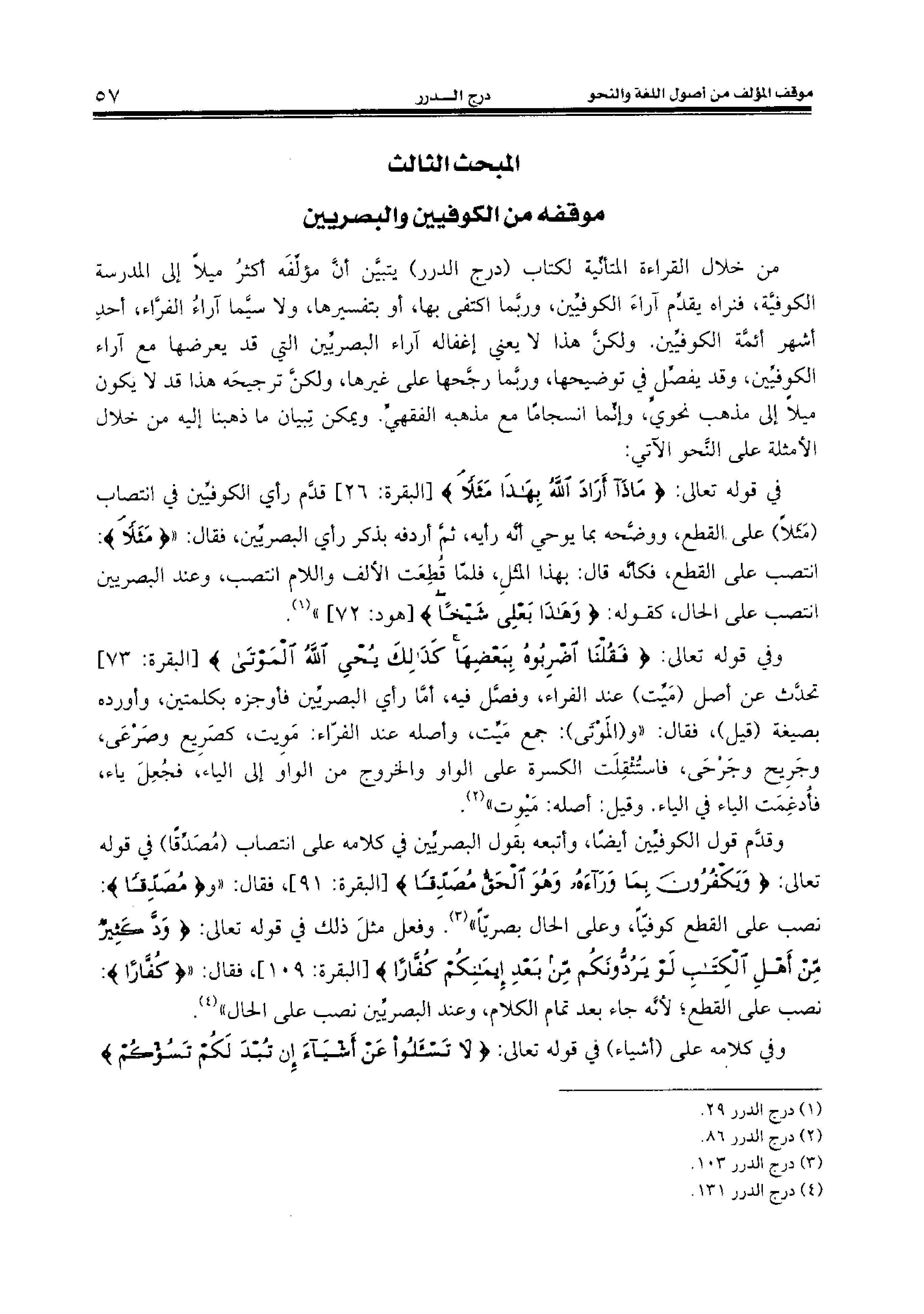 نصب على القطع كوفيّا، وعلى الحال بصريّا» (¬3). وفعل مثل ذلك في قوله تعالى: {وَدَّ كَثِيرٌ مِنْ أَهْلِ الْكِتابِ لَوْ يَرُدُّونَكُمْ مِنْ بَعْدِ إِيمانِكُمْ كُفّاراً} [البقرة:109]، فقال: {كُفّاراً:}