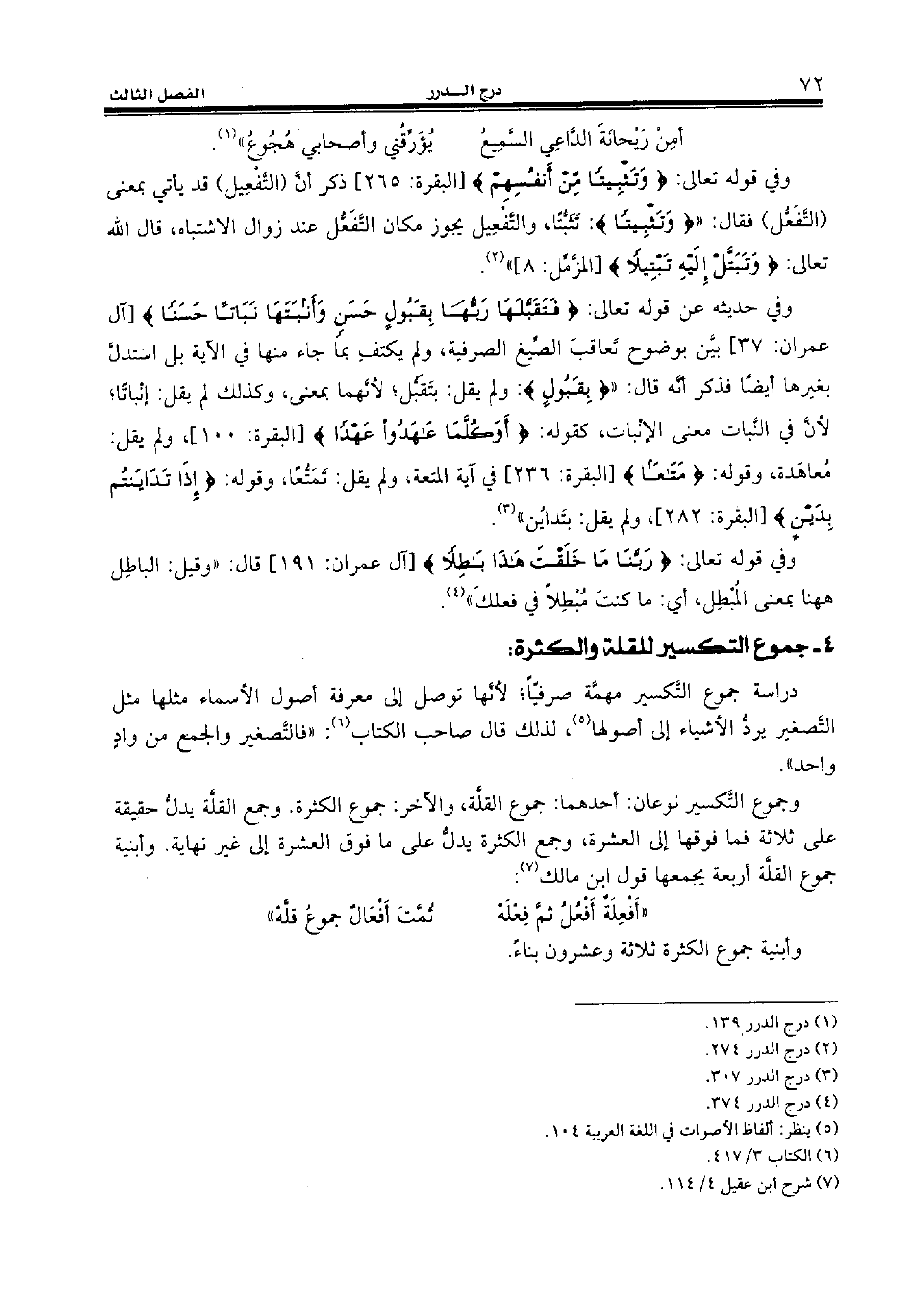 وجموع التّكسير نوعان: أحدهما: جموع القلّة، والآخر: جموع الكثرة. وجمع القلّة يدلّ حقيقة على ثلاثة فما فوقها إلى العشرة، وجمع الكثرة يدلّ على ما فوق العشرة إلى غير نهاية. وأبنية جموع القلّة أربعة يجمعها قول ابن مالك (¬7):