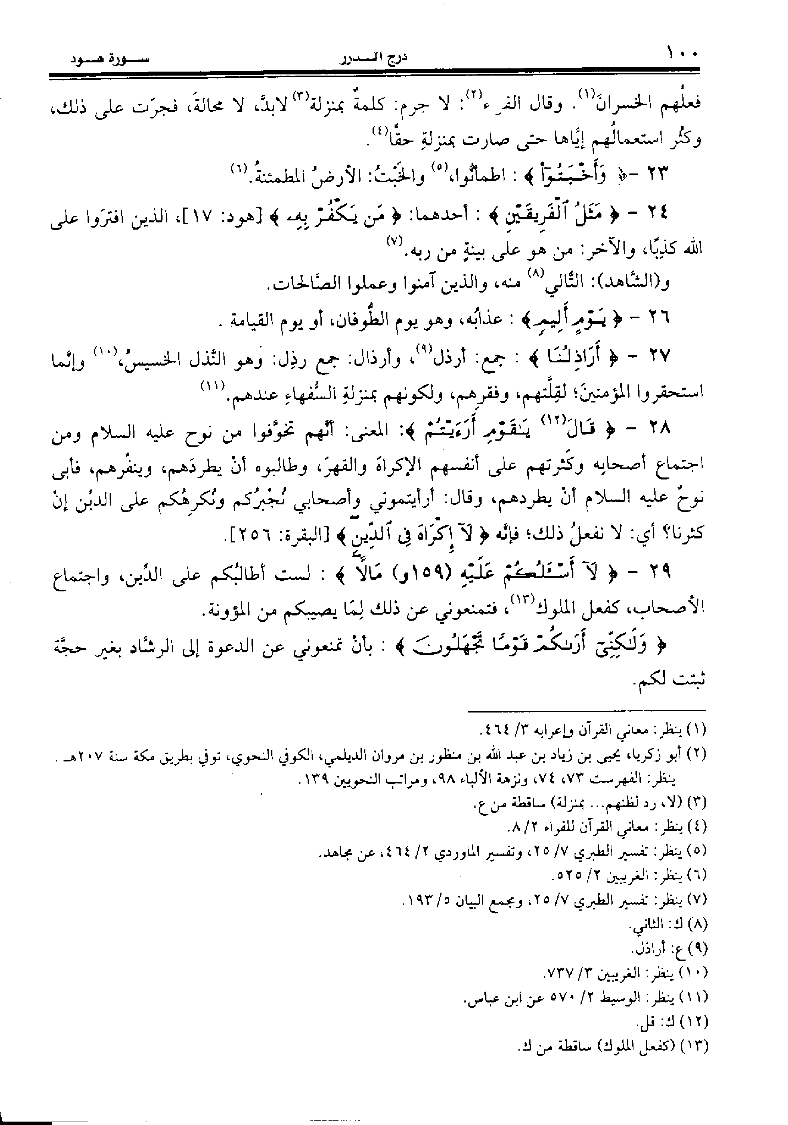 24 - {مَثَلُ الْفَرِيقَيْنِ:} أحدهما: {مَنْ يَكْفُرْ بِهِ} [هود:17]، الذين افتروا على الله كذبا، والآخر: من هو على بينة من ربه. (¬7)