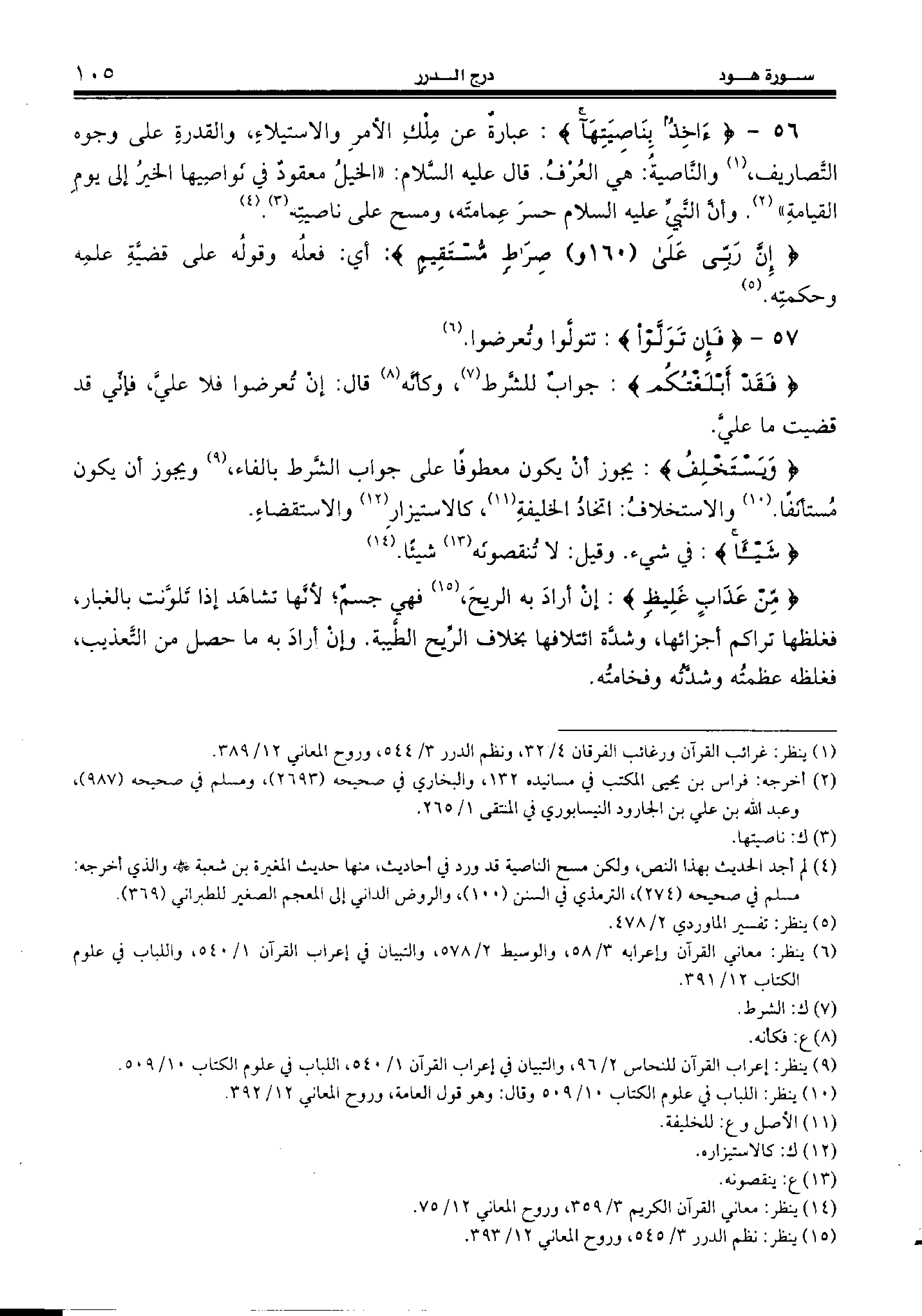 56 - {آخِذٌ بِناصِيَتِها:} عبارة عن ملك الأمر والاستيلاء، والقدرة على وجوه التّصاريف، (¬1) والنّاصية: هي العرف. قال عليه السّلام: «الخيل معقود في نواصيها الخير إلى يوم القيامة» (¬2). وأنّ النّبيّ عليه السّلام حسر عمامته، ومسح على ناصيته (¬3). (¬4)