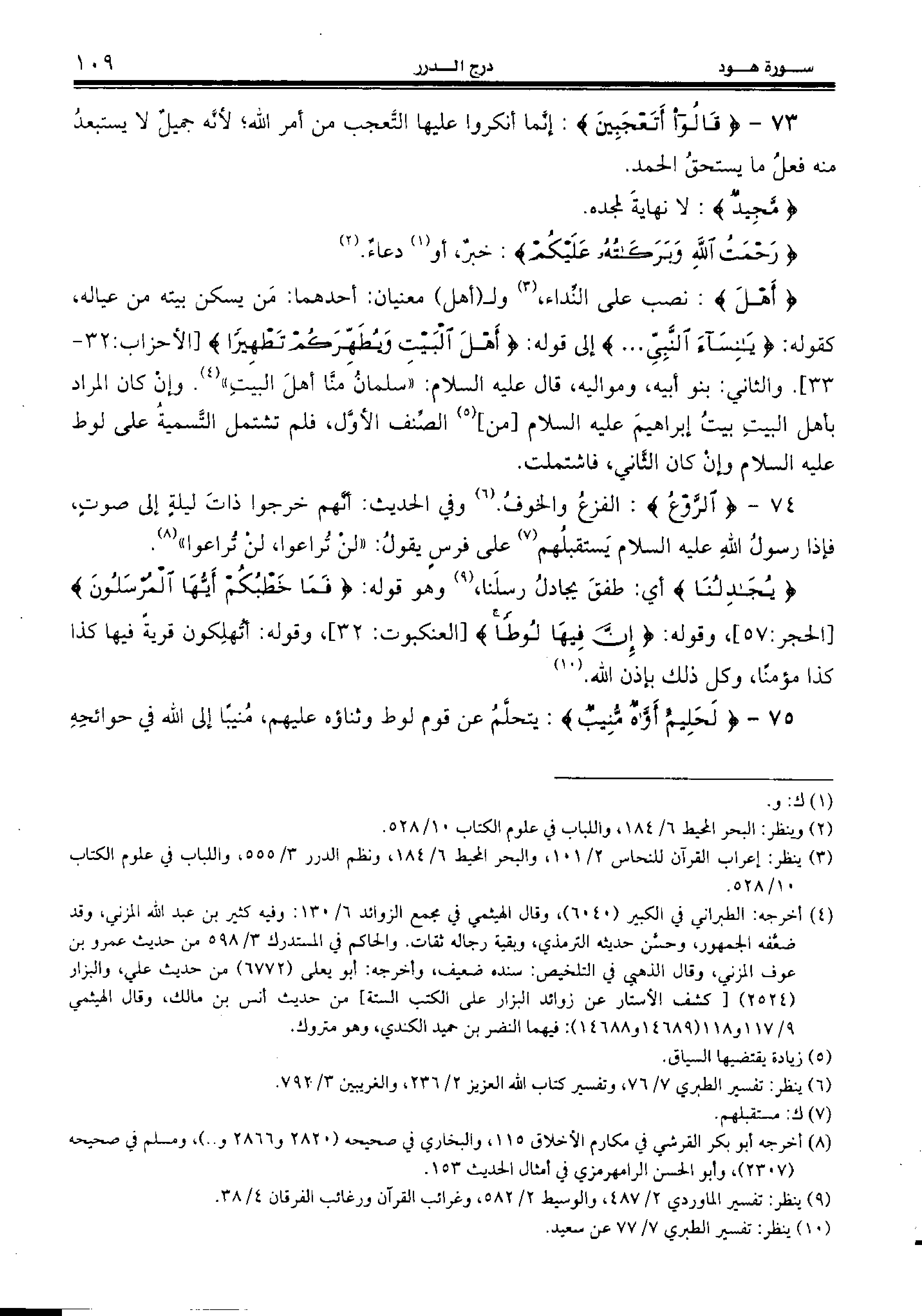 73 - {قالُوا أَتَعْجَبِينَ:} إنّما أنكروا عليها التّعجب من أمر الله؛ لأنّه جميل لا يستبعد منه فعل ما يستحق الحمد.