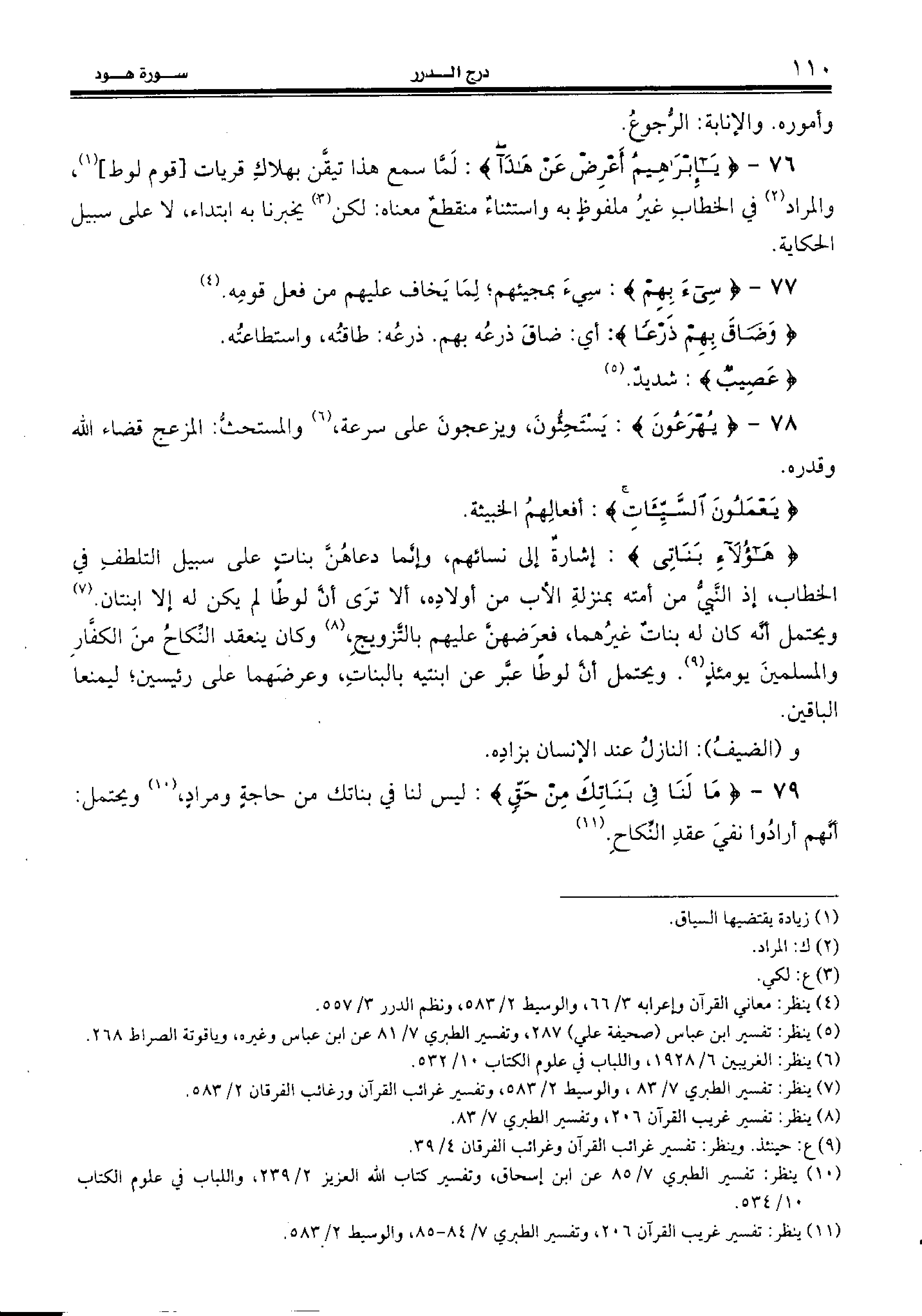 76 - {يا إِبْراهِيمُ أَعْرِضْ عَنْ هذا:} لمّا سمع هذا تيقّن بهلاك قريات [قوم لوط] (¬1)، والمراد (¬2) في الخطاب غير ملفوظ به واستثناء منقطع معناه: لكن (¬3) يخبرنا به ابتداء، لا على سبيل الحكاية.