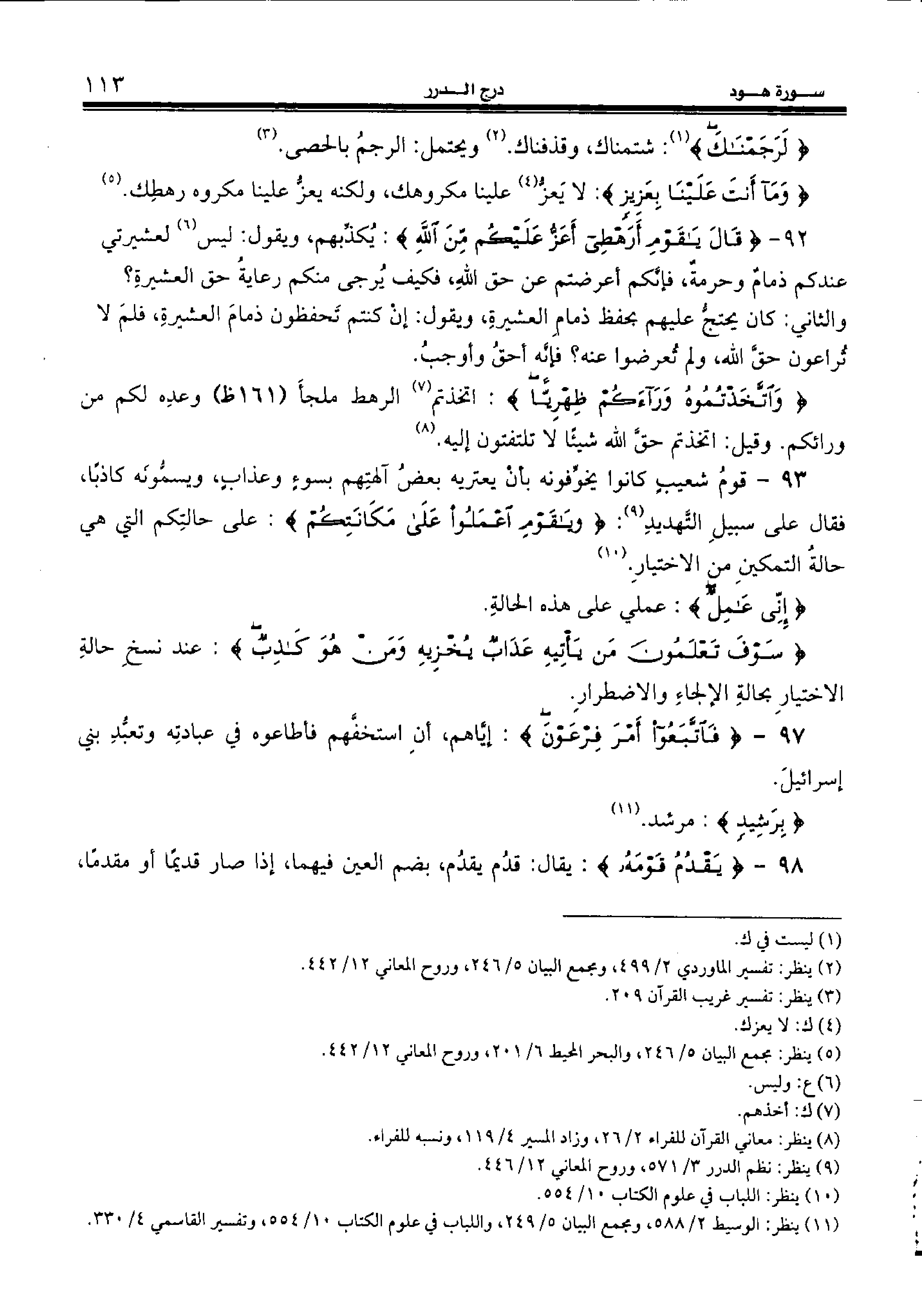 92 - {قالَ يا قَوْمِ أَرَهْطِي أَعَزُّ عَلَيْكُمْ مِنَ اللهِ:} يكذّبهم، ويقول: ليس (¬6) لعشيرتي عندكم ذمام وحرمة، فإنّكم أعرضتم عن حق الله، فكيف يرجى منكم رعاية حق العشيرة؟