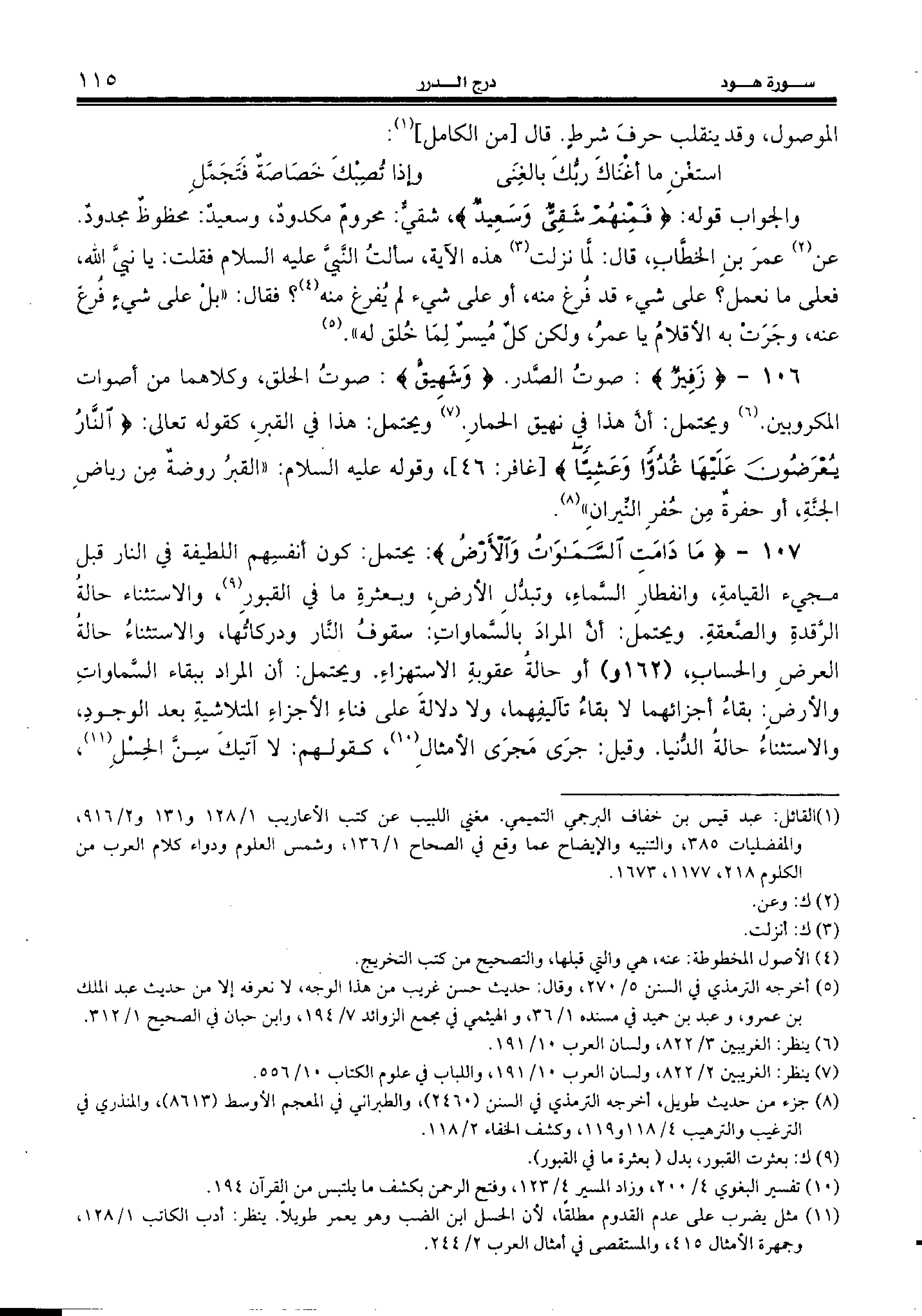 107 - {ما دامَتِ السَّماواتُ وَالْأَرْضُ:} يحتمل: كون أنفسهم اللطيفة في النار قبل مجيء القيامة، وانفطار السّماء، وتبدّل الأرض، وبعثرة ما في القبور (¬9)، والاستثناء حالة الرّقدة والصّعقة. ويحتمل: أنّ المراد بالسّماوات: سقوف النّار ودركاتها، والاستثناء حالة العرض والحساب، (162 و) أو حالة عقوبة الاستهزاء. ويحتمل: أن المراد ببقاء السّماوات والأرض: بقاء أجزائهما لا بقاء تآليفهما، ولا دلالة على فناء الأجزاء المتلاشية بعد الوجود، والاستثناء حالة الدّنيا. وقيل: جرى مجرى الأمثال (¬10)، كقولهم: لا آتيك سنّ الحسل (¬11)،