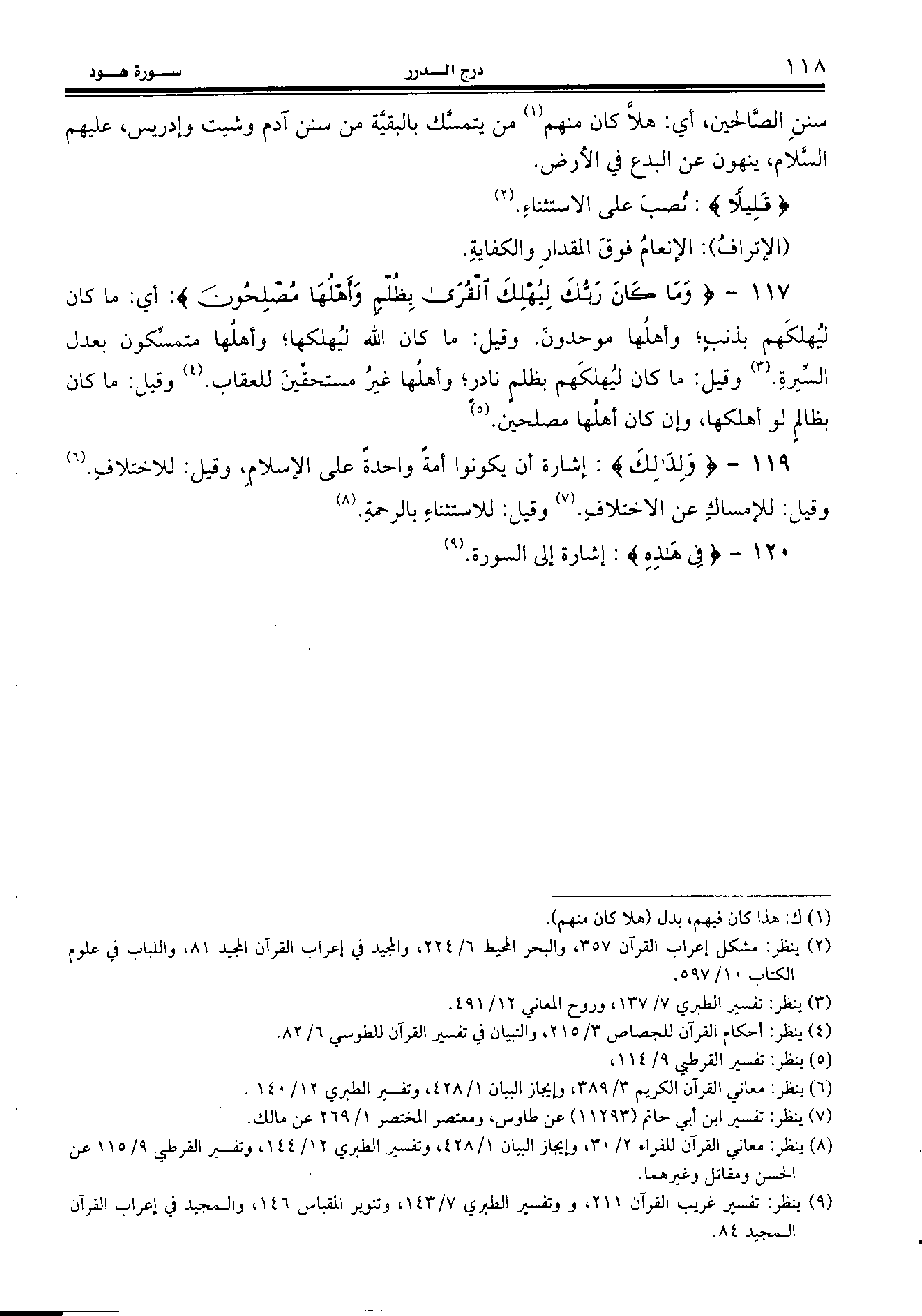 117 - {وَما كانَ رَبُّكَ لِيُهْلِكَ الْقُرى بِظُلْمٍ وَأَهْلُها مُصْلِحُونَ:} أي: ما كان ليهلكهم بذنب؛ وأهلها موحدون. وقيل: ما كان الله ليهلكها؛ وأهلها متمسّكون بعدل السّيرة. (¬3) وقيل: ما كان ليهلكهم بظلم نادر؛ وأهلها غير مستحقّين للعقاب. (¬4) وقيل: ما كان بظالم لو أهلكها، وإن كان أهلها مصلحين. (¬5)
