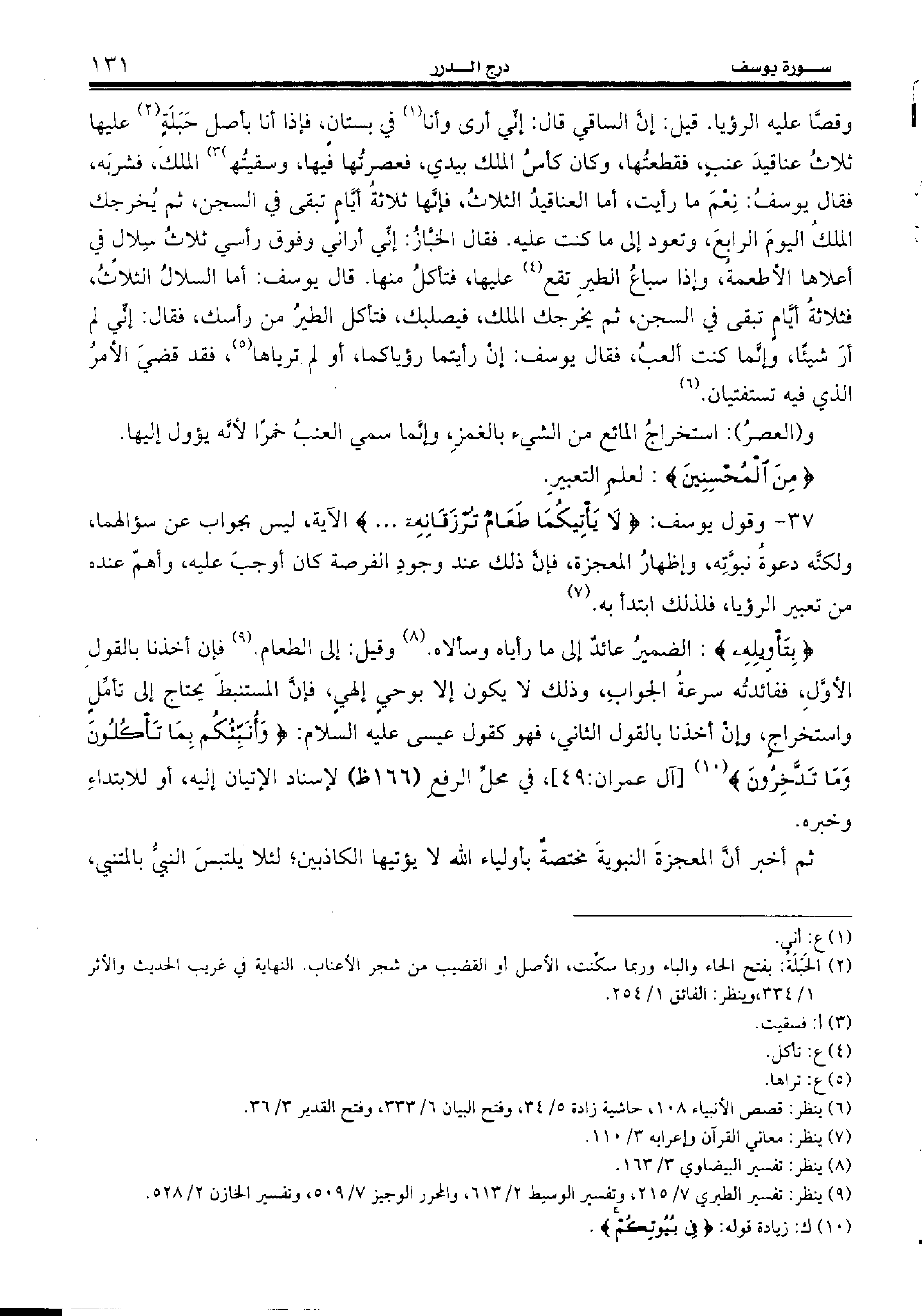 37 - وقول يوسف: {لا يَأْتِيكُما طَعامٌ تُرْزَقانِهِ. . .} الآية، ليس بجواب عن سؤالهما، ولكنّه دعوة نبوّته، وإظهار المعجزة، فإنّ ذلك عند وجود الفرصة كان أوجب عليه، وأهمّ عنده من تعبير الرؤيا، فلذلك ابتدأ به. (¬7)