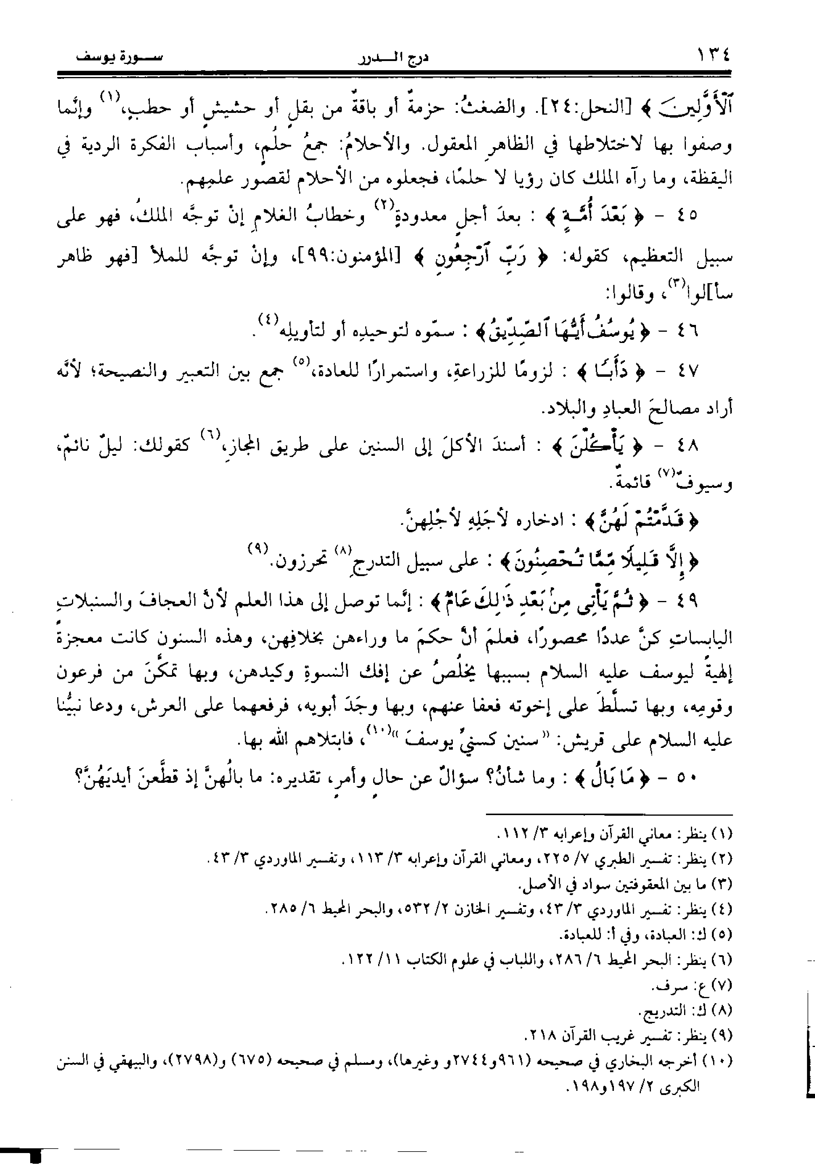 47 - {دَأَباً:} لزوما للزراعة، واستمرارا للعادة، (¬5) جمع بين التعبير والنصيحة؛ لأنّه أراد مصالح العباد والبلاد.