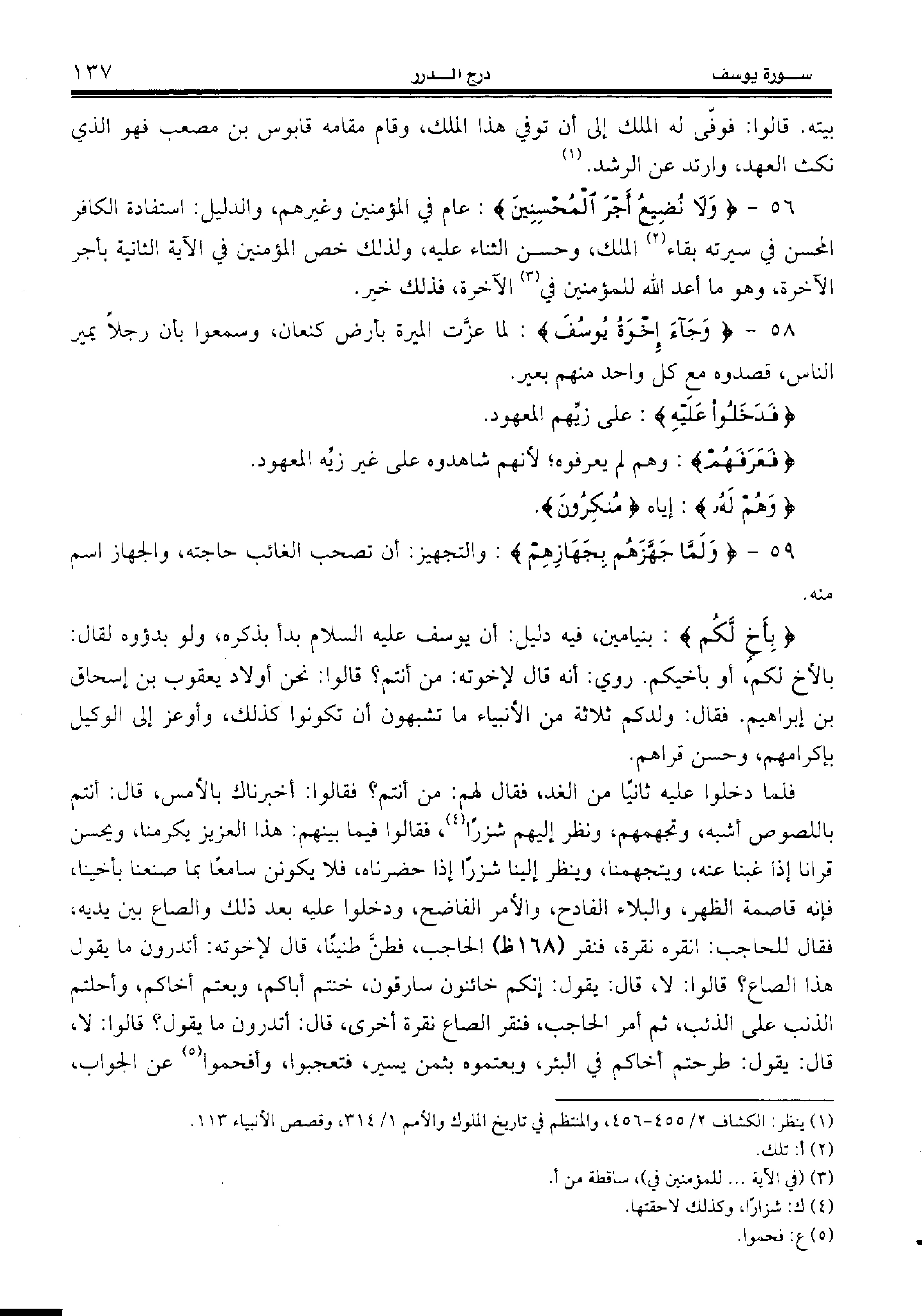 56 - {وَلا نُضِيعُ أَجْرَ الْمُحْسِنِينَ:} عام في المؤمنين وغيرهم، والدليل: استفادة الكافر المحسن في سيرته بقاء (¬2) الملك، وحسن الثناء عليه، ولذلك خص المؤمنين في الآية الثانية بأجر الآخرة، وهو ما أعد الله للمؤمنين في (¬3) الآخرة، فذلك خير.