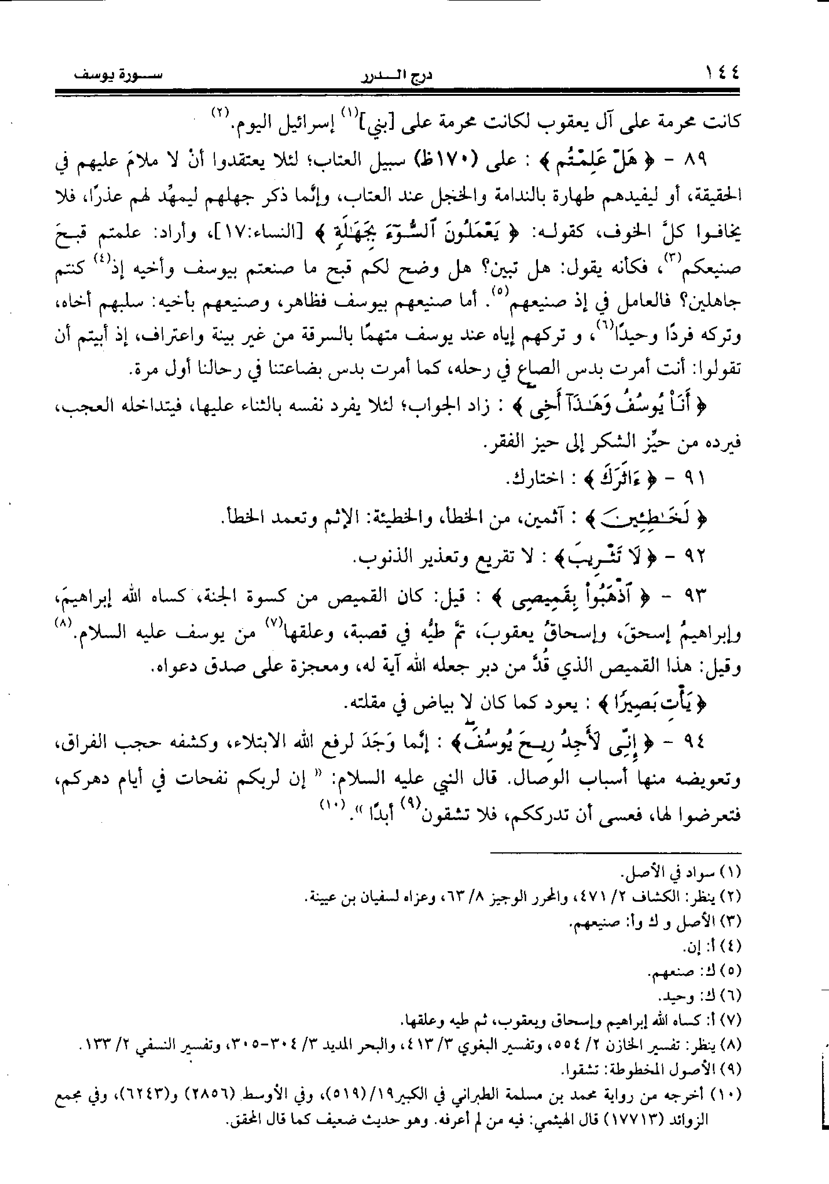 89 - {هَلْ عَلِمْتُمْ:} على (170 ظ) سبيل العتاب؛ لئلا يعتقدوا أن لا ملام عليهم في الحقيقة، أو ليفيدهم طهارة بالندامة والخجل عند العتاب، وإنّما ذكر جهلهم ليمهّد لهم عذرا، فلا يخافوا كلّ الخوف، كقوله: {يَعْمَلُونَ السُّوءَ بِجَهالَةٍ} [النساء:17]، وأراد: علمتم قبح صنيعكم (¬3)، فكأنه يقول: هل تبين؟ هل وضح لكم قبح ما صنعتم بيوسف وأخيه إذ (¬4) كنتم جاهلين؟ فالعامل في إذ صنيعهم (¬5). أما صنيعهم بيوسف فظاهر، وصنيعهم بأخيه: سلبهم أخاه، وتركه فردا وحيدا (¬6)، وتركهم إياه عند يوسف متهما بالسرقة من غير بينة واعتراف، إذ أبيتم أن تقولوا: أنت أمرت بدس الصاع في رحله، كما أمرت بدس بضاعتنا في رحالنا أول مرة.