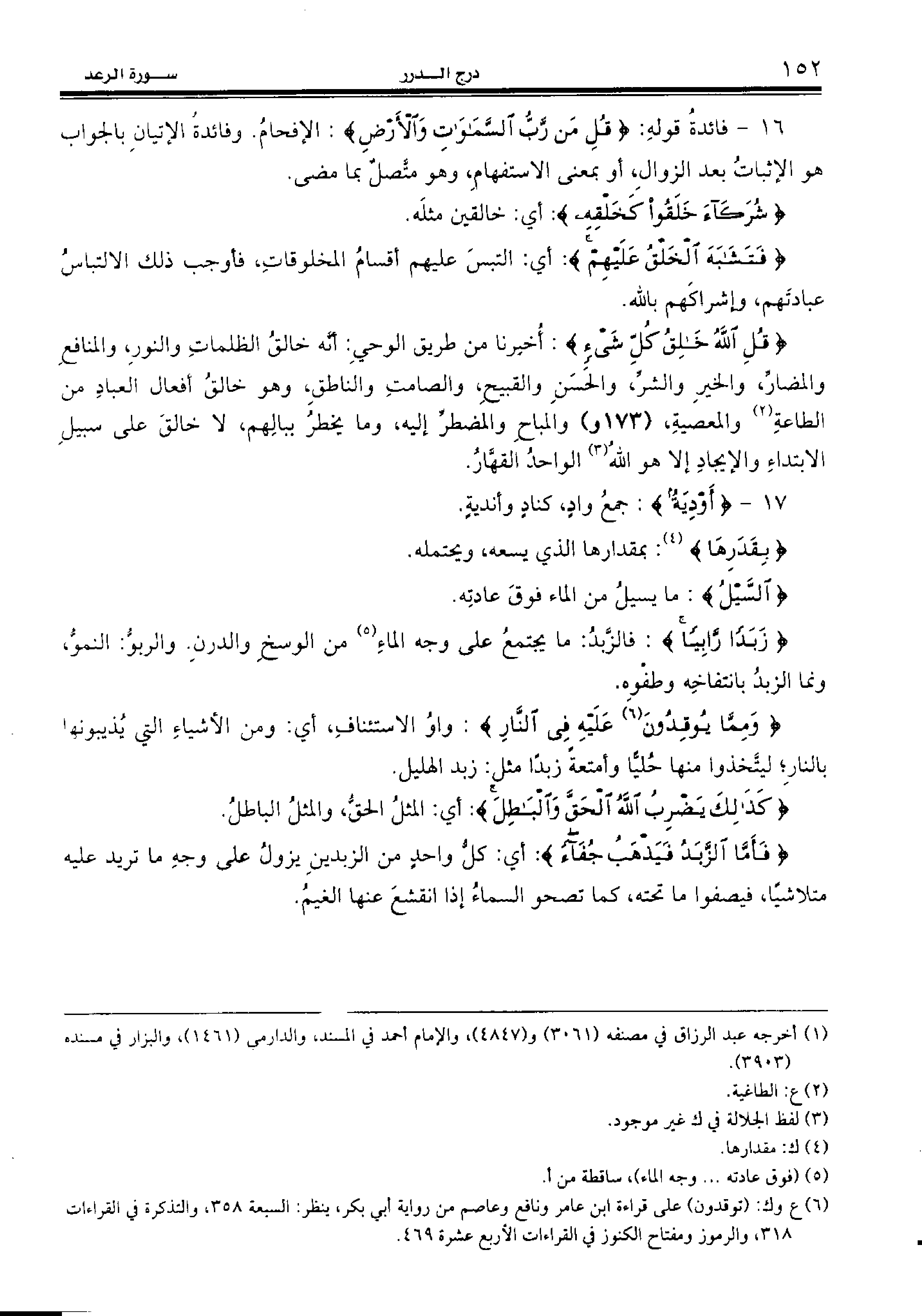 {زَبَداً رابِياً:} فالزّبد: ما يجتمع على وجه الماء (¬5) من الوسخ والدرن. والربوّ: النموّ، ونما الزبد بانتفاخه وطفوه.