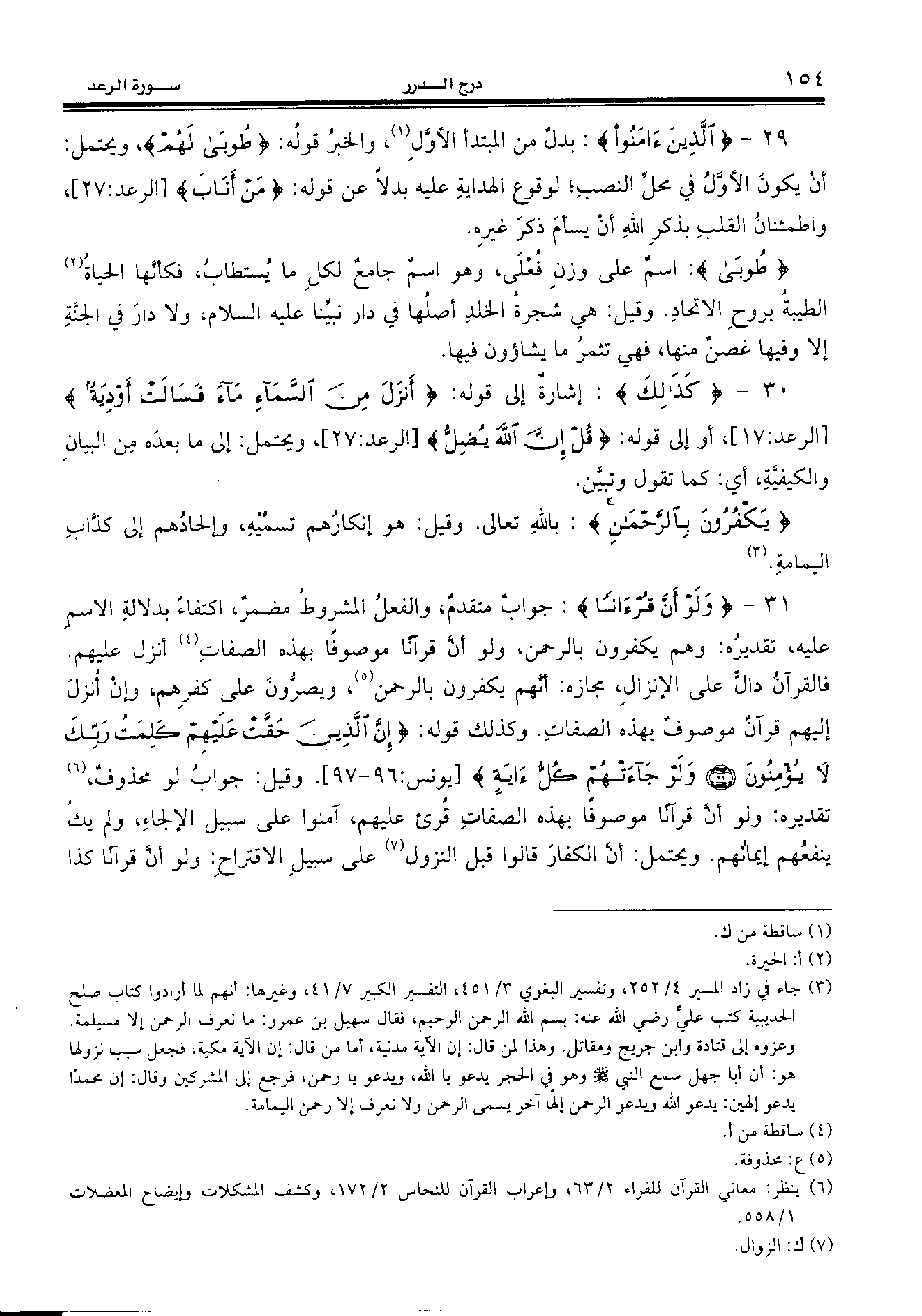 31 - {وَلَوْ أَنَّ قُرْآناً:} جواب متقدم، والفعل المشروط مضمر، اكتفاء بدلالة الاسم عليه، تقديره: وهم يكفرون بالرحمن، ولو أنّ قرآنا موصوفا بهذه الصفات (¬4) أنزل عليهم.