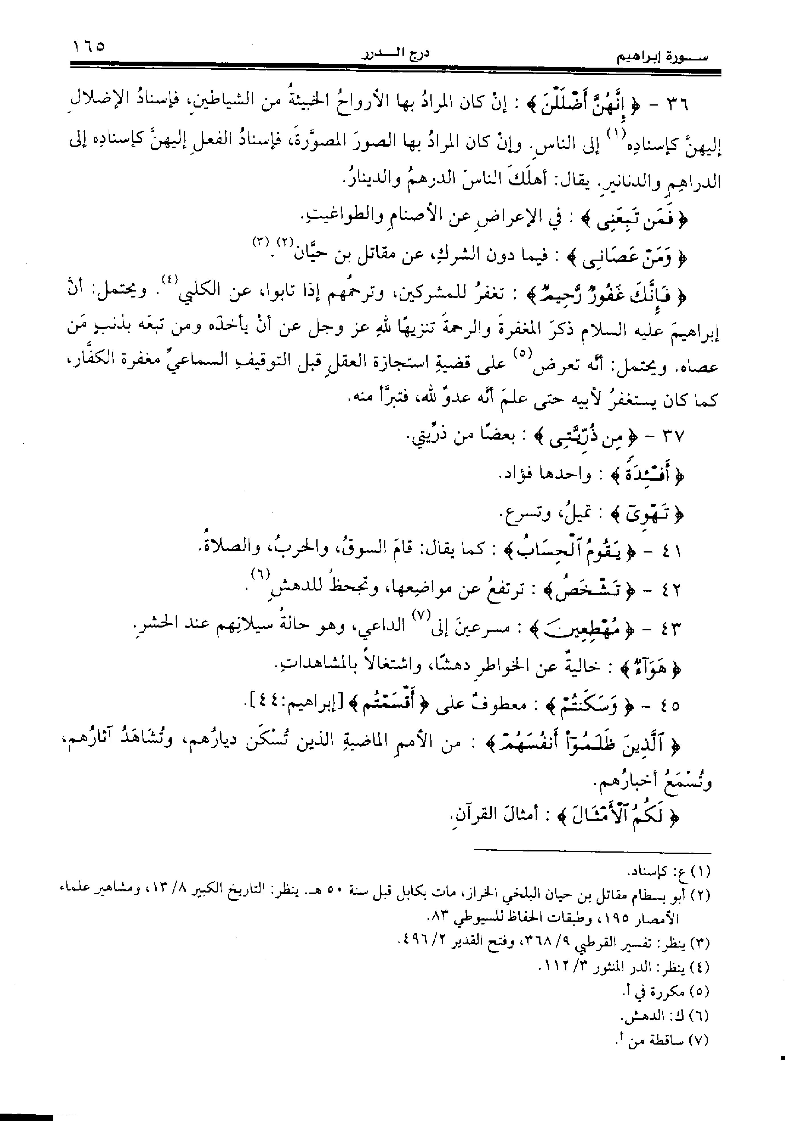36 - {إِنَّهُنَّ أَضْلَلْنَ:} إن كان المراد بها الأرواح الخبيثة من الشياطين، فإسناد الإضلال إليهنّ كإسناده (¬1) إلى الناس. وإن كان المراد بها الصور المصوّرة، فإسناد الفعل إليهنّ كإسناده إلى الدراهم والدنانير. يقال: أهلك الناس الدرهم والدينار.