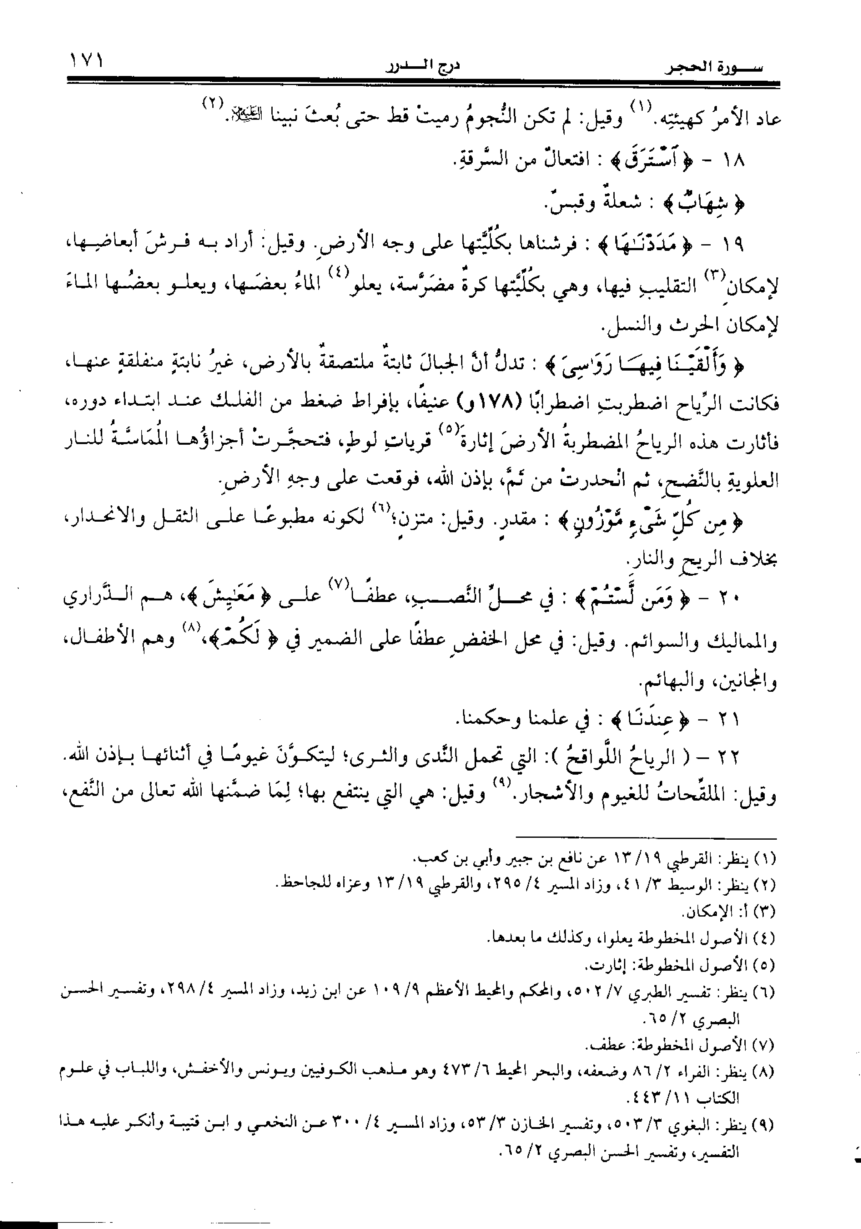 {وَأَلْقَيْنا فِيها رَواسِيَ:} تدلّ أنّ الجبال ثابتة ملتصقة بالأرض، غير نابتة منفلقة عنها، فكانت الرّياح اضطربت اضطرابا (178 و) عنيفا، بإفراط ضغط من الفلك عند ابتداء دوره، فأثارت هذه الرياح المضطربة الأرض إثارة (¬5) قريات لوط، فتحجّرت أجزاؤها المماسّة للنار العلوية بالنّضح، ثم انحدرت من تمّ، بإذن الله، فوقعت على وجه الأرض.