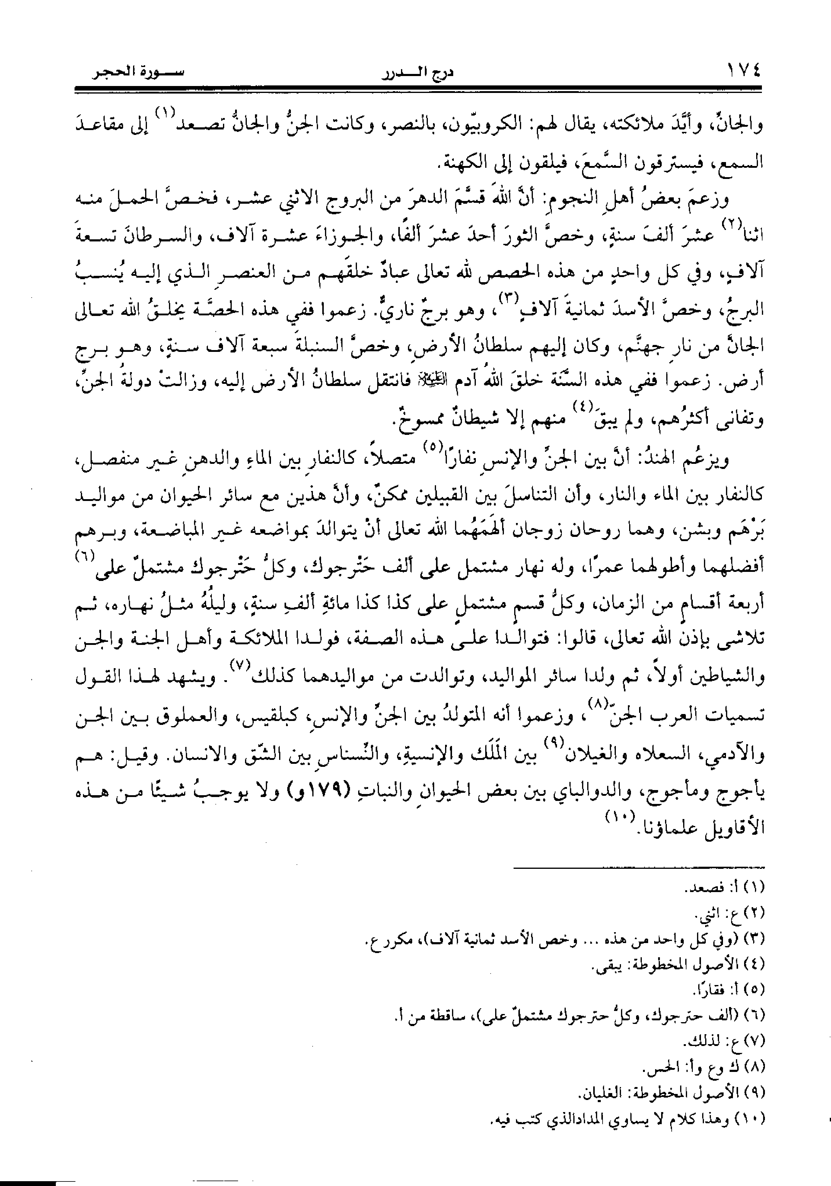 ويزعم الهند: أنّ بين الجنّ والإنس نفارا (¬5) متصلا، كالنفار بين الماء والدهن غير منفصل، كالنفار بين الماء والنار، وأن التناسل بين القبيلين ممكن، وأنّ هذين مع سائر الحيوان من مواليد برهم وبشن، وهما روحان زوجان ألهمهما الله تعالى أن يتوالد بمواضعه غير المباضعة، وبرهم أفضلهما وأطولهما عمرا، وله نهار مشتمل على ألف حترجوك، وكلّ حترجوك مشتمل على (¬6) أربعة أقسام من الزمان، وكلّ قسم مشتمل على كذا كذا مائة ألف سنة، وليله مثل نهاره، ثم تلاشى بإذن الله تعالى، قالوا: فتوالدا على هذه الصفة، فولدا الملائكة وأهل الجنة والجن والشياطين أولا، ثم ولدا سائر المواليد، وتوالدت من مواليدهما كذلك (¬7). ويشهد لهذا القول تسميات العرب الجنّ (¬8)، وزعموا أنه المتولد بين الجنّ والإنس، كبلقيس، والعملوق بين الجن والآدمي، السعلاه والغيلان (¬9) بين الملك والإنسية، والنّسناس بين الشّق والانسان. وقيل: هم يأجوج ومأجوج، والدوالباي بين بعض الحيوان والنبات (179 و) ولا يوجب شيئا من هذه الأقاويل علماؤنا. (¬10)