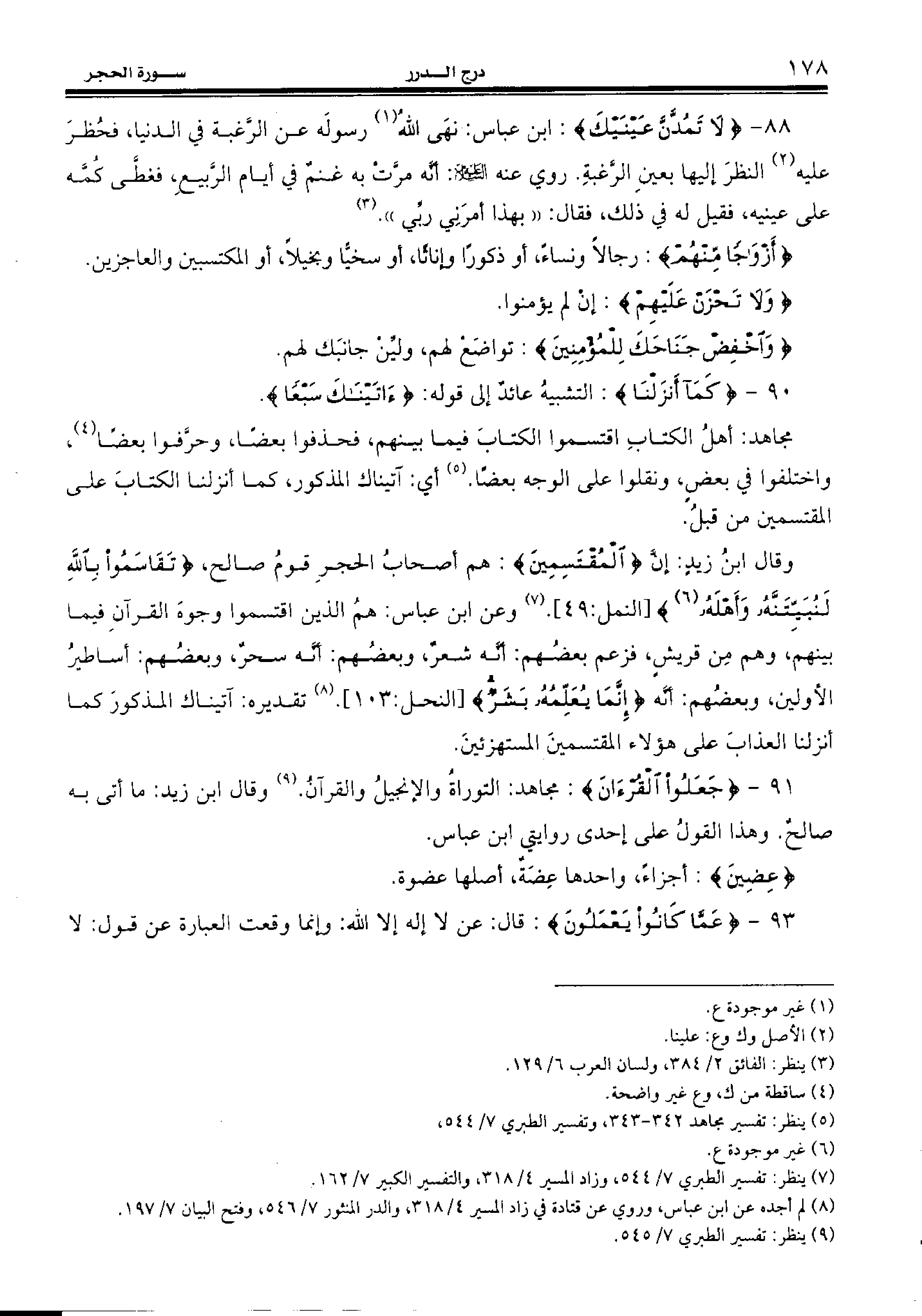 88 - {لا تَمُدَّنَّ عَيْنَيْكَ:} ابن عباس: نهى الله (¬1) رسوله عن الرّغبة في الدنيا، فحظر عليه (¬2) النظر إليها بعين الرّغبة. روي عنه عليه السّلام: أنّه مرّت به غنم في أيام الرّبيع، فغطّى كمّه على عينيه، فقيل له في ذلك، فقال: «بهذا أمرني ربّي». (¬3)