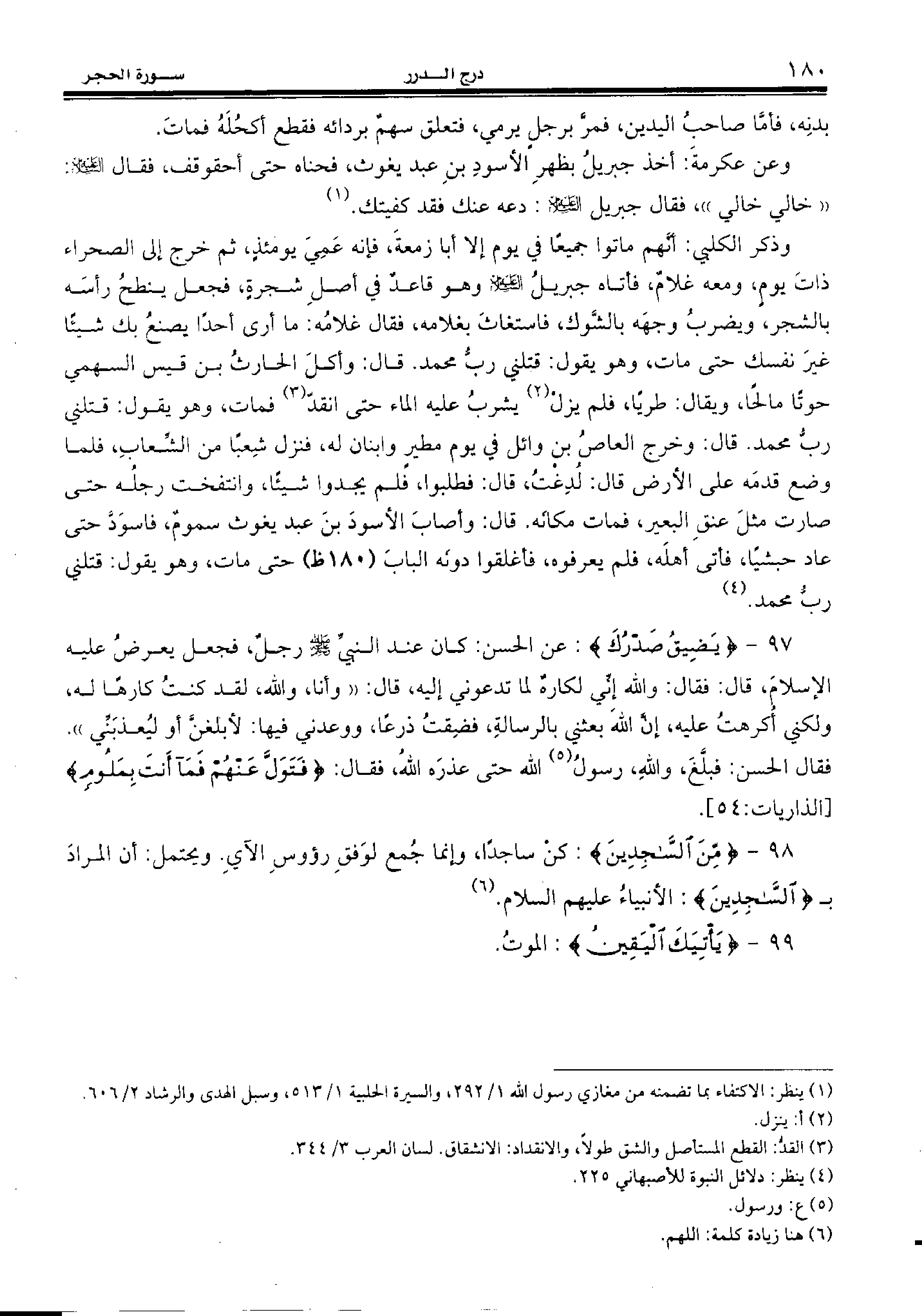98 - {مِنَ السّاجِدِينَ:} كن ساجدا، وإنما جمع لوفق رؤوس الآي. ويحتمل: أن المراد ب {السّاجِدِينَ:} الأنبياء عليهم السّلام. (¬6)