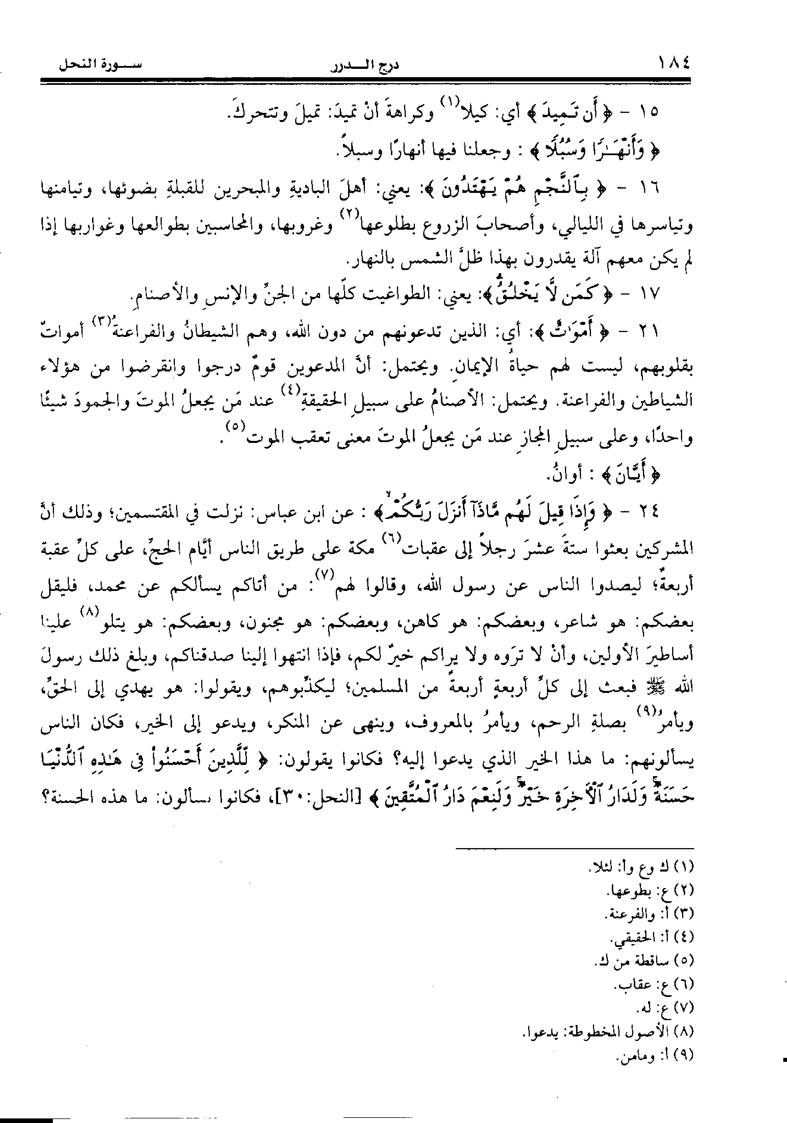 24 - {وَإِذا قِيلَ لَهُمْ ماذا أَنْزَلَ رَبُّكُمْ:} عن ابن عباس: نزلت في المقتسمين؛ وذلك أنّ المشركين بعثوا ستة عشر رجلا إلى عقبات (¬6) مكة على طريق الناس أيّام الحجّ، على كلّ عقبة أربعة؛ ليصدوا الناس عن رسول الله، وقالوا لهم (¬7): من أتاكم يسألكم عن محمد، فليقل بعضكم: هو شاعر، وبعضكم: هو كاهن، وبعضكم: هو مجنون، وبعضكم: هو يتلو (¬8) علينا أساطير الأولين، وأن لا تروه ولا يراكم خير لكم، فإذا انتهوا إلينا صدقناكم، وبلغ ذلك رسول الله صلّى الله عليه وسلّم فبعث إلى كلّ أربعة أربعة من المسلمين؛ ليكذّبوهم، ويقولوا: هو يهدي إلى الحقّ، ويأمر (¬9) بصلة الرحم، ويأمر بالمعروف، وينهى عن المنكر، ويدعو إلى الخير، فكان الناس يسألونهم: ما هذا الخير الذي يدعوا إليه؟ فكانوا يقولون: {لِلَّذِينَ أَحْسَنُوا فِي هذِهِ الدُّنْيا حَسَنَةٌ وَلَدارُ الْآخِرَةِ خَيْرٌ وَلَنِعْمَ دارُ الْمُتَّقِينَ} [النحل:30]، فكانوا يسألون: ما هذه الحسنة؟