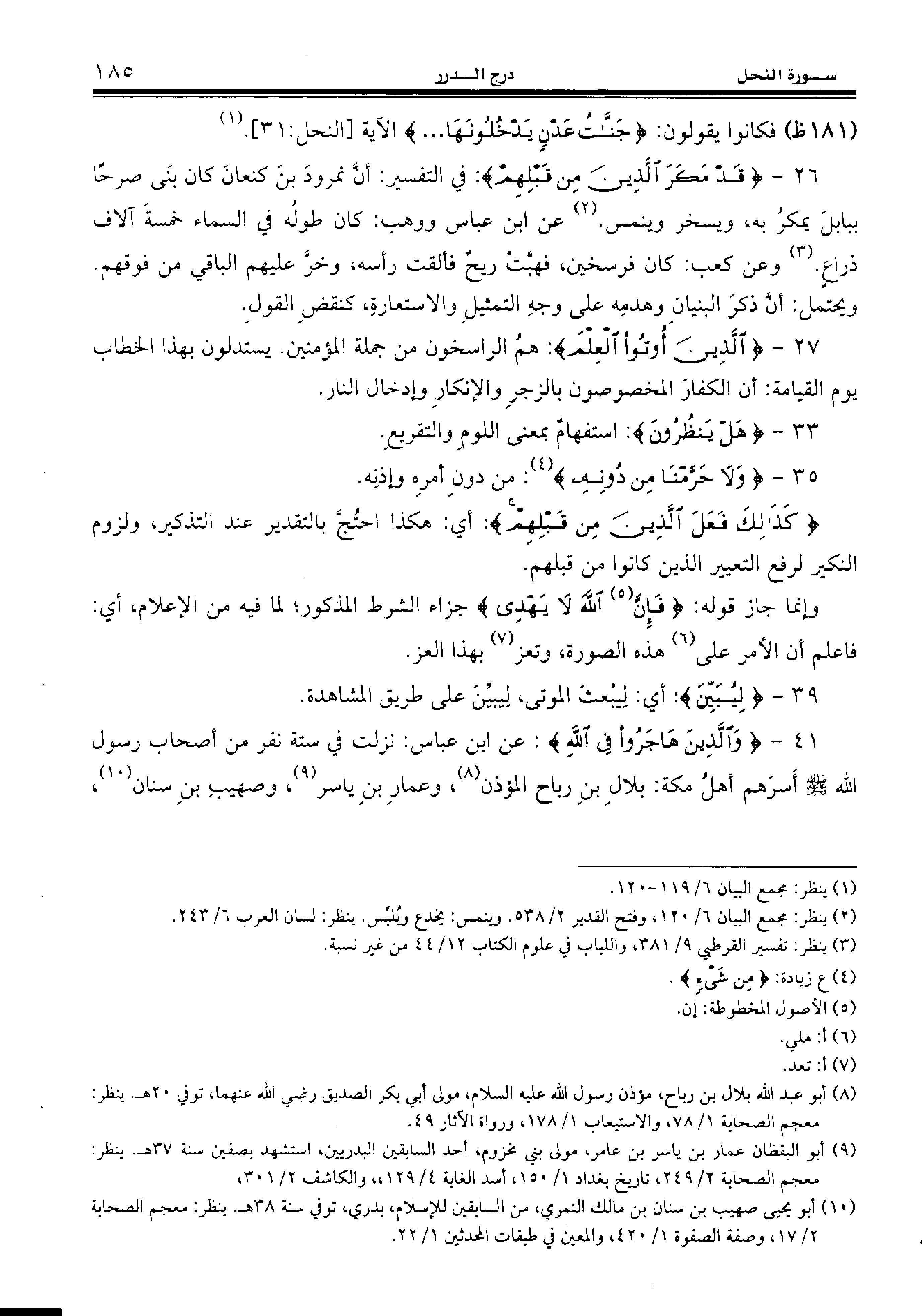 41 - {وَالَّذِينَ هاجَرُوا فِي اللهِ:} عن ابن عباس: نزلت في ستة نفر من أصحاب رسول الله صلّى الله عليه وسلّم أسرهم أهل مكة: بلال بن رباح المؤذن (¬8)، وعمار بن ياسر (¬9)، وصهيب بن سنان (¬10)،