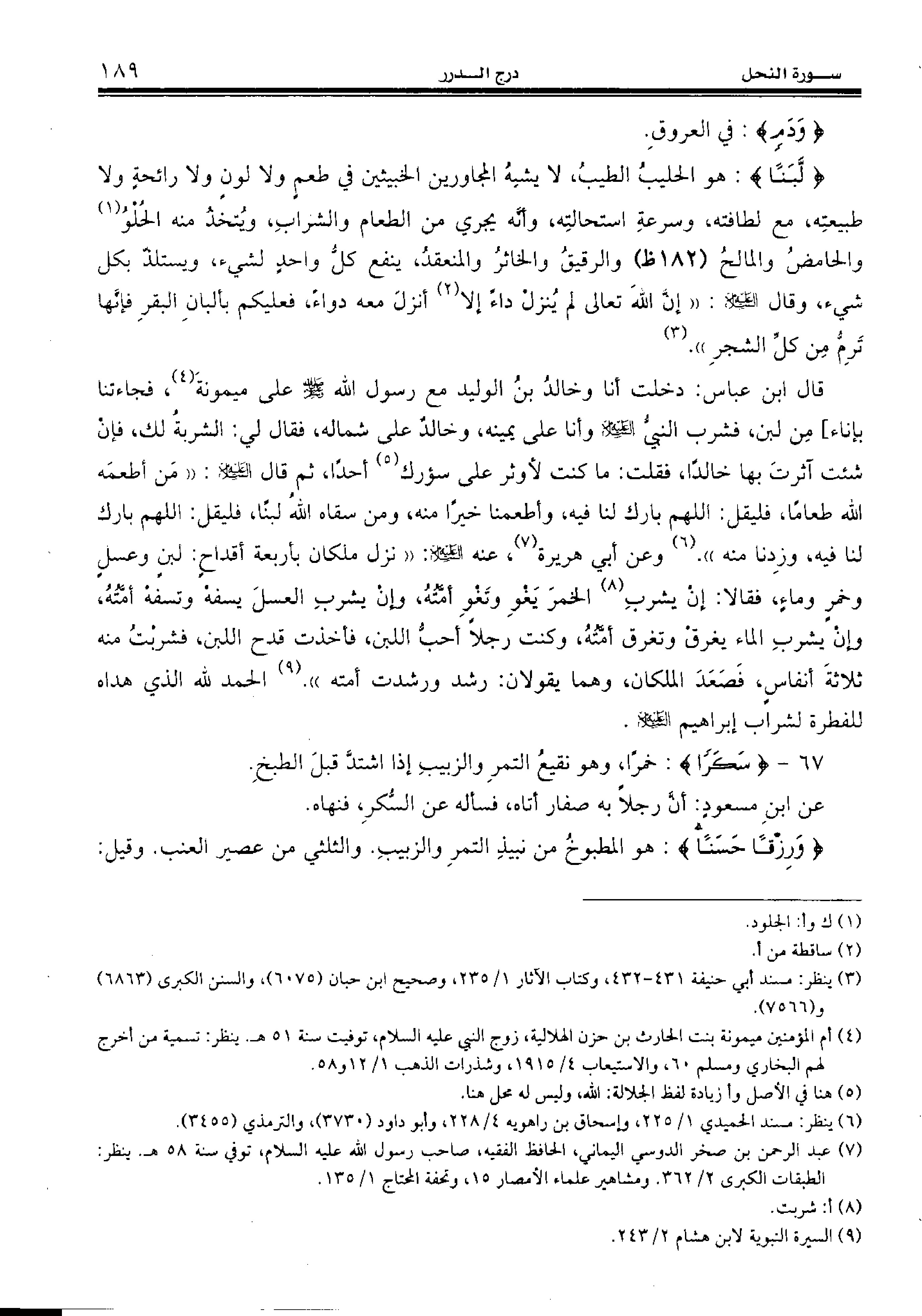 قال ابن عباس: دخلت أنا وخالد بن الوليد مع رسول الله صلّى الله عليه وسلّم على ميمونة (¬4)، فجاءتنا بإناء] من لبن، فشرب النبيّ عليه السّلام وأنا على يمينه، وخالد على شماله، فقال لي: الشربة لك، فإن شئت آثرت بها خالدا، فقلت: ما كنت لأوثر على سؤرك (¬5) أحدا، ثم قال عليه السّلام: «من أطعمه الله طعاما، فليقل: اللهم بارك لنا فيه، وأطعمنا خيرا منه، ومن سقاه الله لبنا، فليقل: اللهم بارك لنا فيه، وزدنا منه». (¬6) وعن أبي هريرة (¬7)، عنه عليه السّلام: «نزل ملكان بأربعة أقداح: لبن وعسل وخمر وماء، فقالا: إن يشرب (¬8) الخمر يغو وتغو أمّته، وإن يشرب العسل يسفه وتسفه أمّته، وإن يشرب الماء يغرق وتغرق أمّته، وكنت رجلا أحبّ اللبن، فأخذت قدح اللبن، فشربت منه ثلاثة أنفاس، فصعد الملكان، وهما يقولان: رشد ورشدت أمته». (¬9) الحمد لله الذي هداه للفطرة لشراب إبراهيم عليه السّلام.